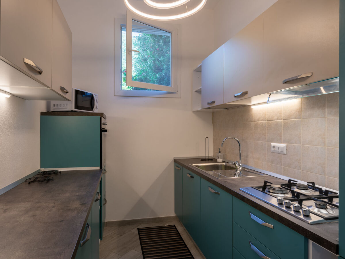 Cuisine ouverte (four, lave-vaisselle, 4 feux, grille-pain, bouilloire électrique, micro-ondes, congélateur, gril, cafetière électrique) avec table pour les repas.