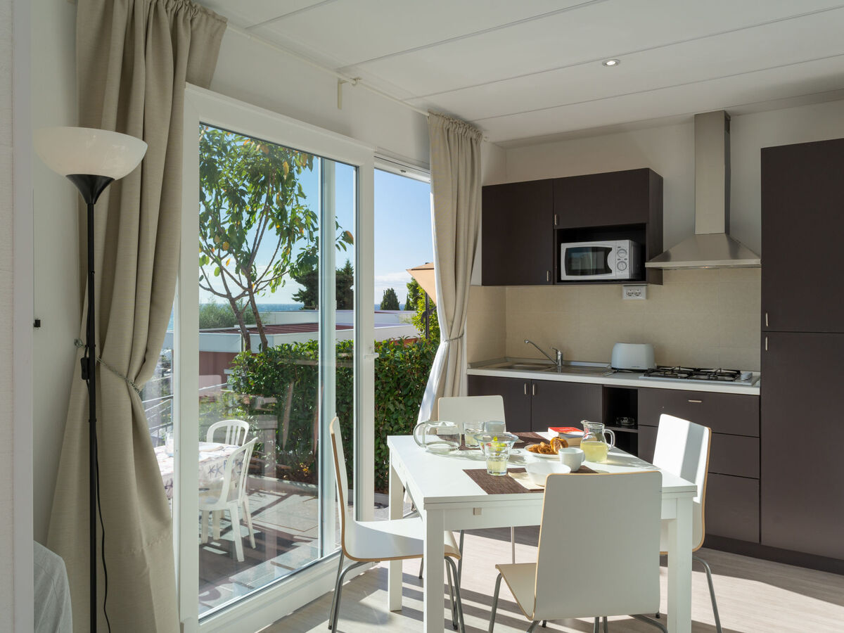 Cuisine/séjour (4 feux, grille-pain, micro-ondes, congélateur, cafetière électrique) avec table pour les repas, TV (satellite).