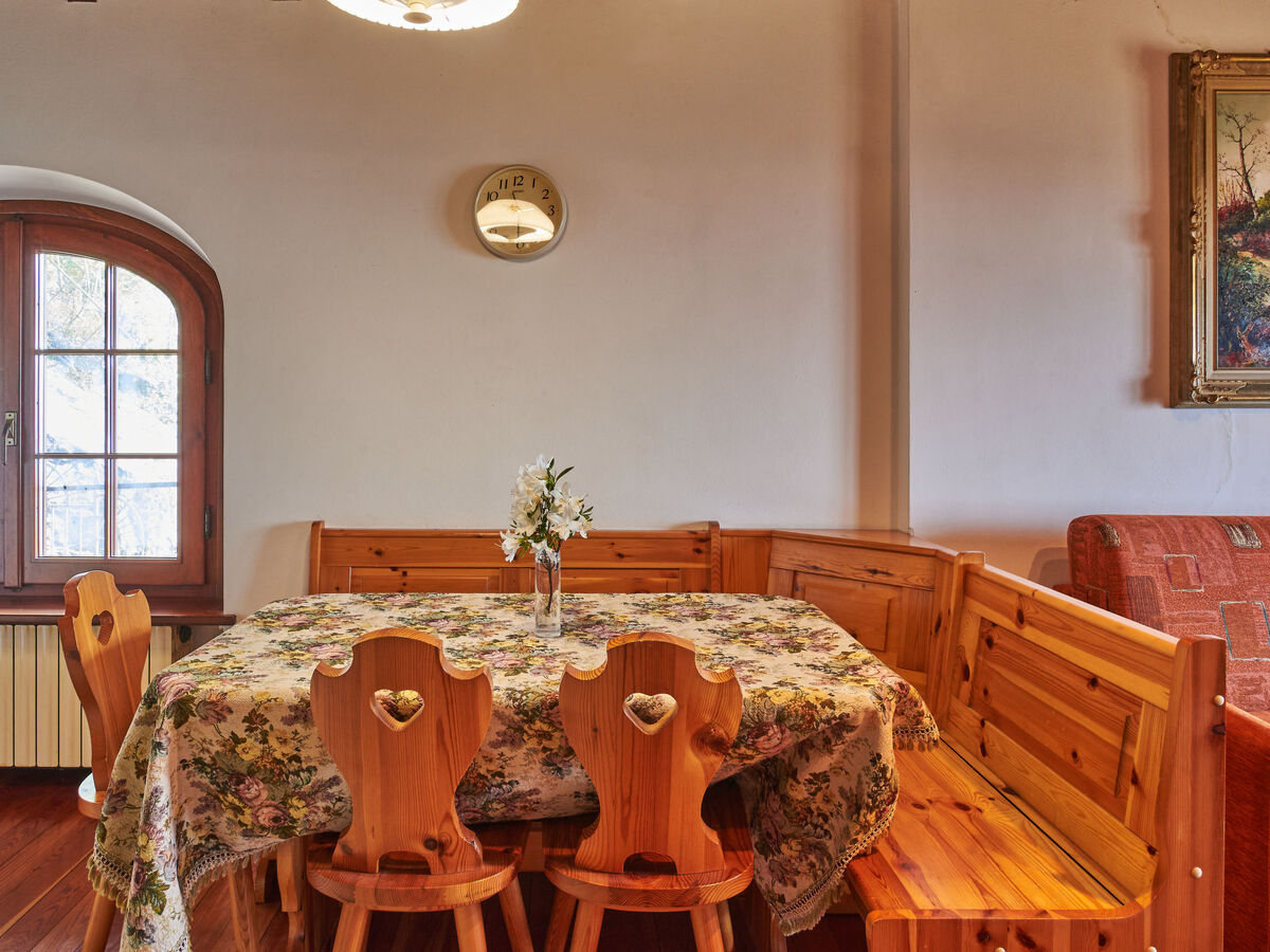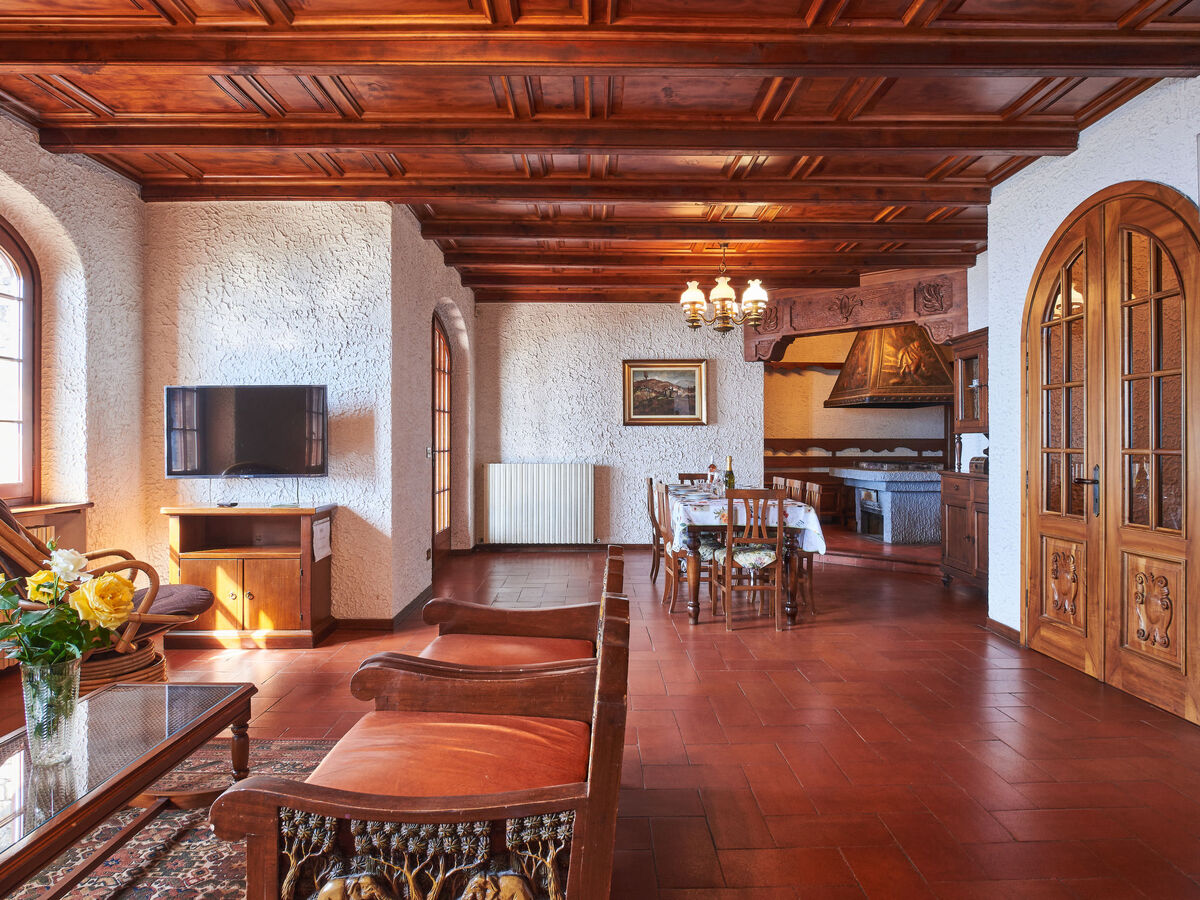 Aménagement agréable et rustique: grand séjour/salle à manger avec table pour les repas et TV (satellite).