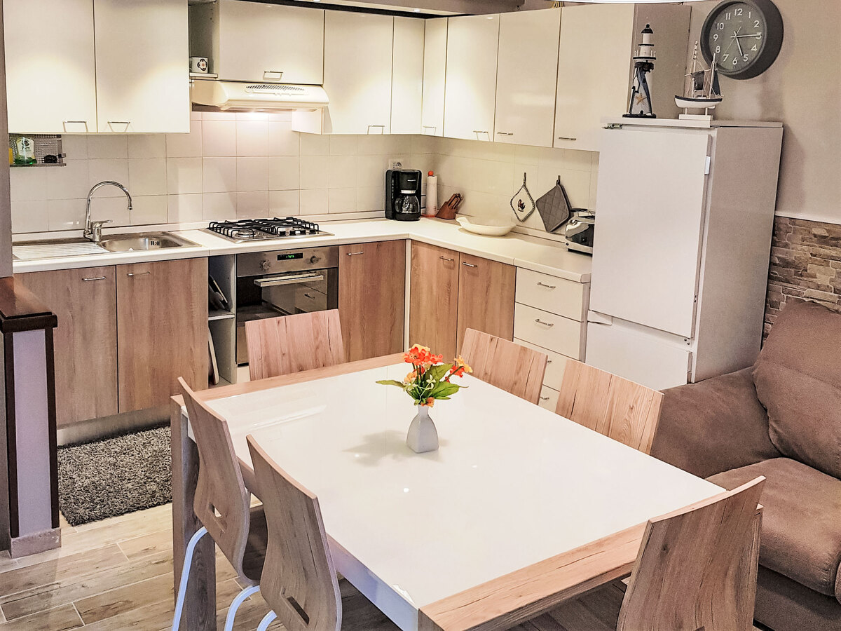 Cuisine ouverte (four, 4 feux, congélateur, cafetière électrique).