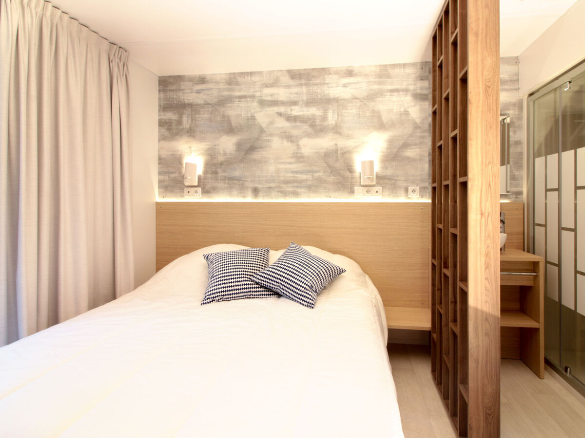 1 chambre avec 1 grand-lit (160 cm, longueur 200 cm), douche/WC.
