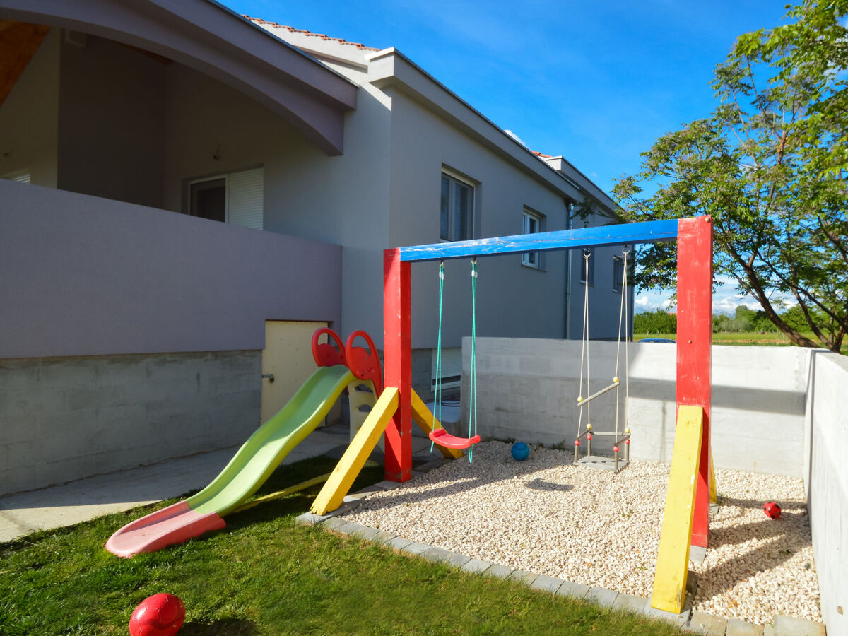 Douche extérieure, meubles de jardin (toboggan, balançoire).