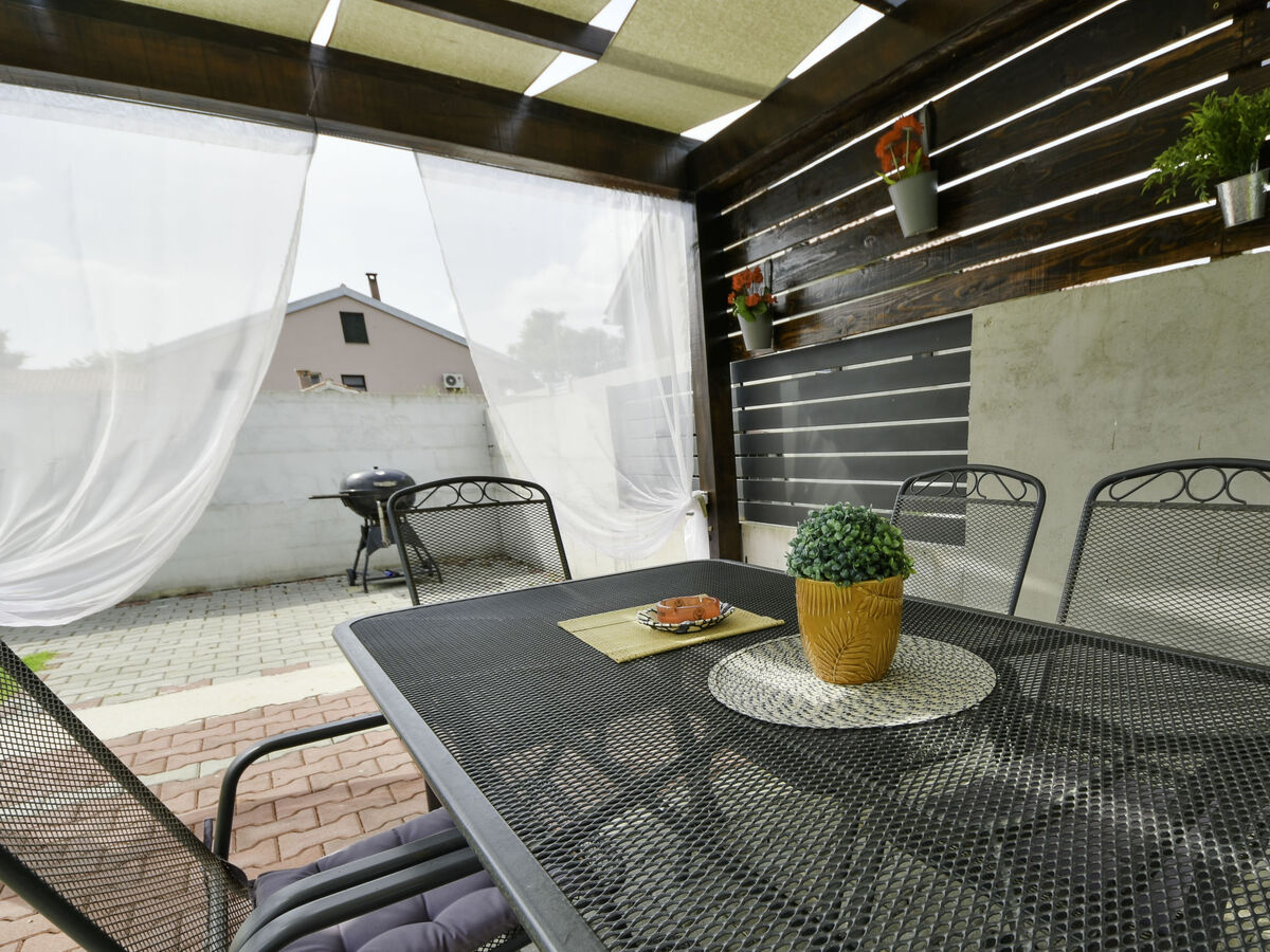 Meubles de terrasse, barbecue (portable), chaises longues.