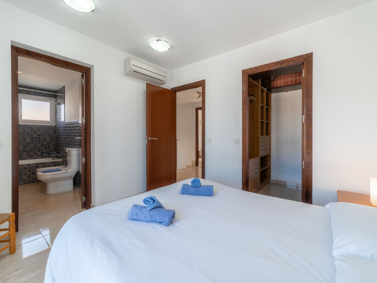 À l'étage supérieur: 1 grande chambre double avec baie vitrée Dressing avec 1 grand-lit (150 cm, longueur 190 cm), bain/bidet/WC, air-conditionné et chauffage à air chaud.