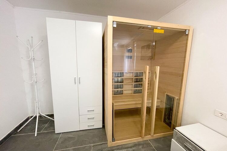 Rez-de-chaussée: (Salle de séjour(canapé-lit double, TV(écran plat, satellite)), cuisine(table, bouilloire, grille-pain, plaque de cuisson, cafetière/percolateur, four, micro ondes, lave-vaisselle , combinaison réfrigérateur/congélateur), chambre(lit double), salle de bains(douche, lavabo, WC, lave-linge ), terrasse(privé, 15 m2)) Bain à bulles, sauna(privé), chauffage, climatisation, terrasse(privé, 15 m2), mobilier de jardin, transats, barbecue, parking, parasol, salon de jardin