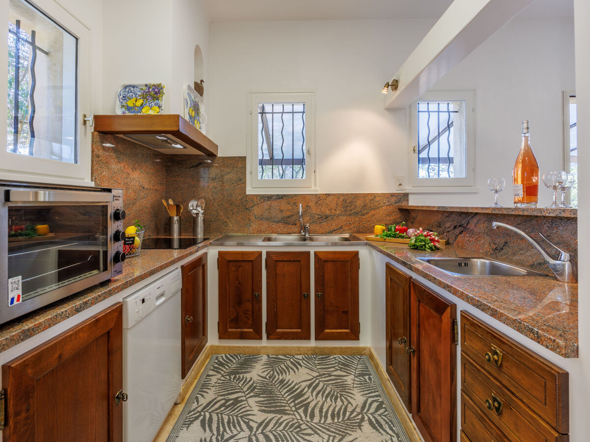 Cuisine ouverte (four, lave-vaisselle, 4 plaques à induction, grille-pain, bouilloire électrique, micro-ondes, congélateur, cafetière électrique, appareil à raclette) avec radio.