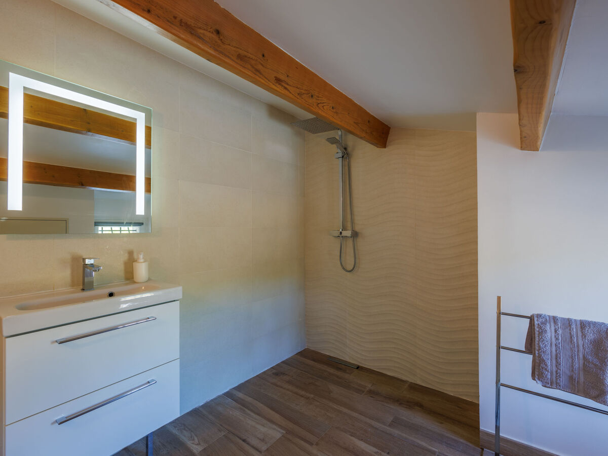 1 chambre avec 1 grand-lit (180 cm, longueur 200 cm), douche/WC.