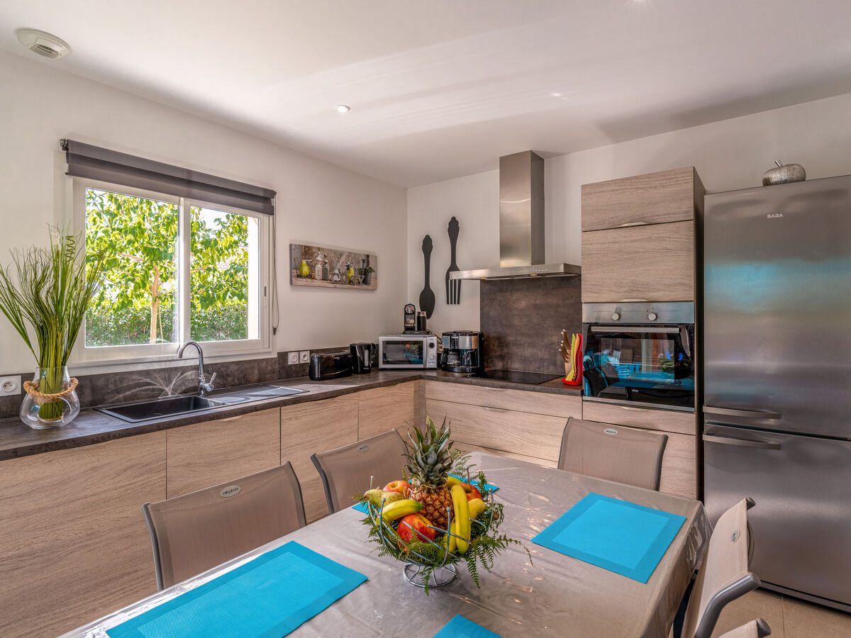 Cuisine ouverte (four, lave-vaisselle, 3 plaques vitrocéramiques, grille-pain, bouilloire électrique, micro-ondes, congélateur, cafetière électrique).