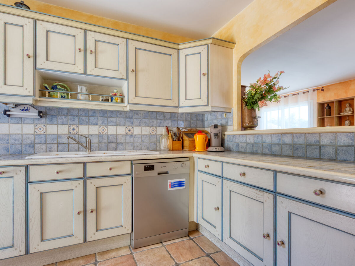 Cuisine ouverte (four, lave-vaisselle, 2 plaques à induction, 2 feux, grille-pain, bouilloire électrique, micro-ondes, congélateur, cafetière électrique).