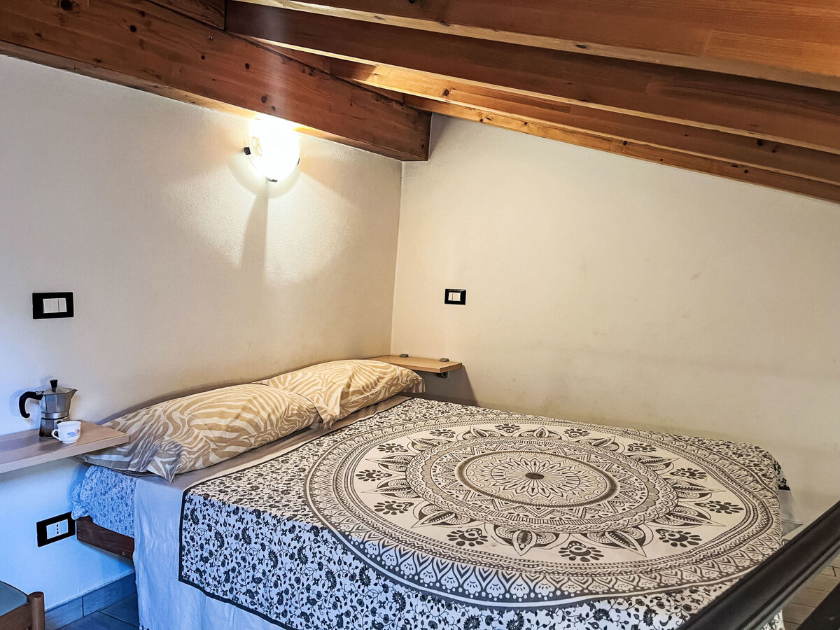 À l'étage supérieur: (escalier extérieur) séjour/chambre à coucher avec 1 divan-lit double (125 cm), table pour les repas et TV (satellite).