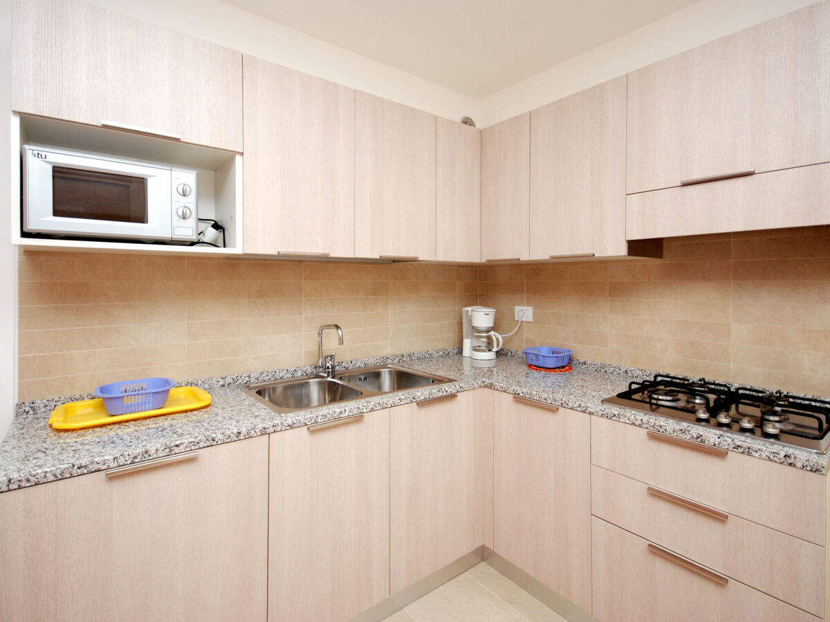 Aménagement moderne et de bon goût: séjour/chambre à coucher avec 1 divan-lit double, table pour les repas, coin-cuisine et TV (satellite).
