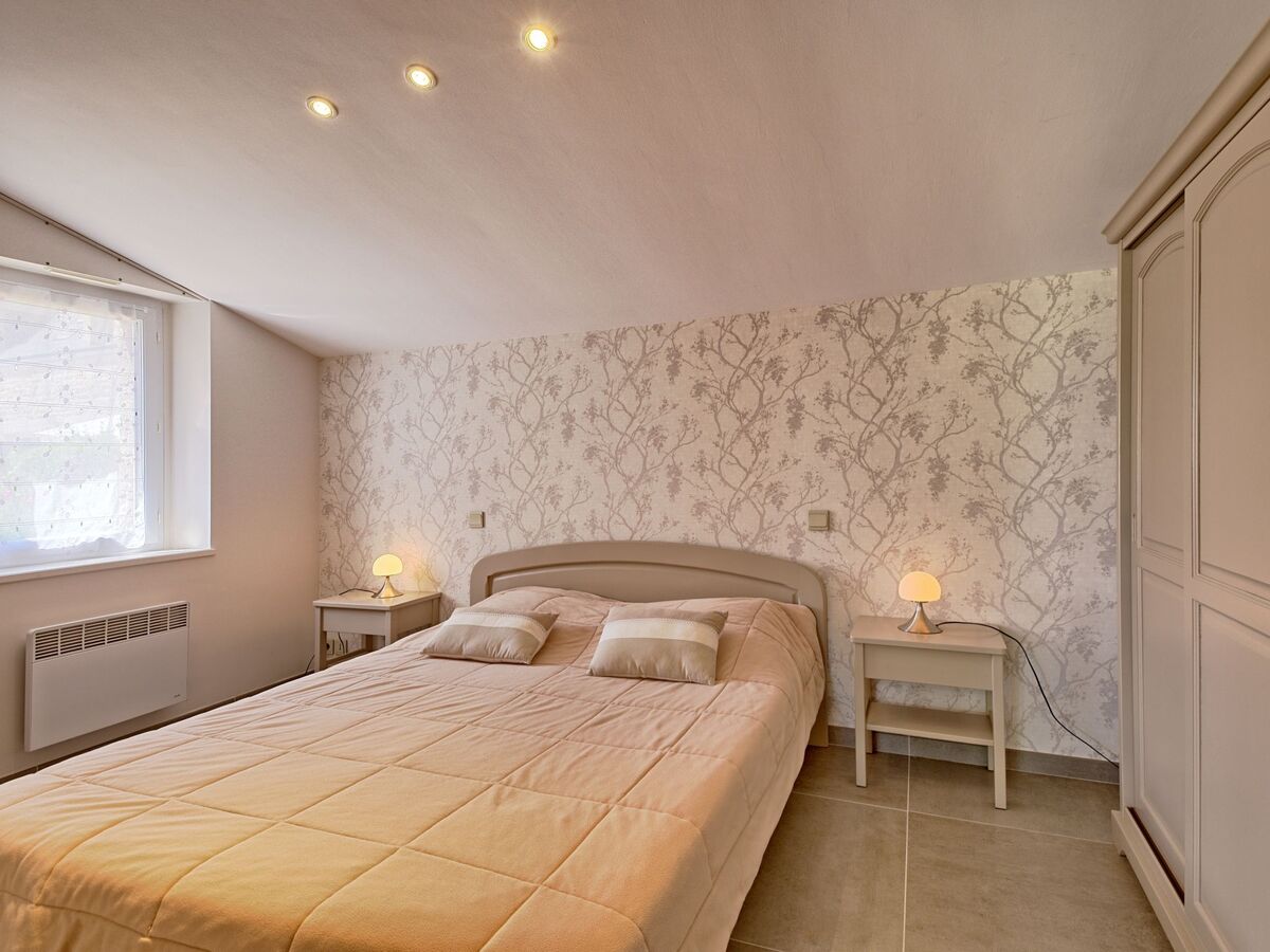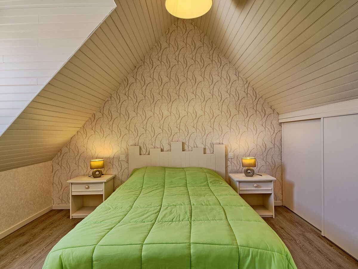 À l'étage supérieur: 1 chambre, mansardée avec 1 grand-lit (140 cm, longueur 190 cm).
