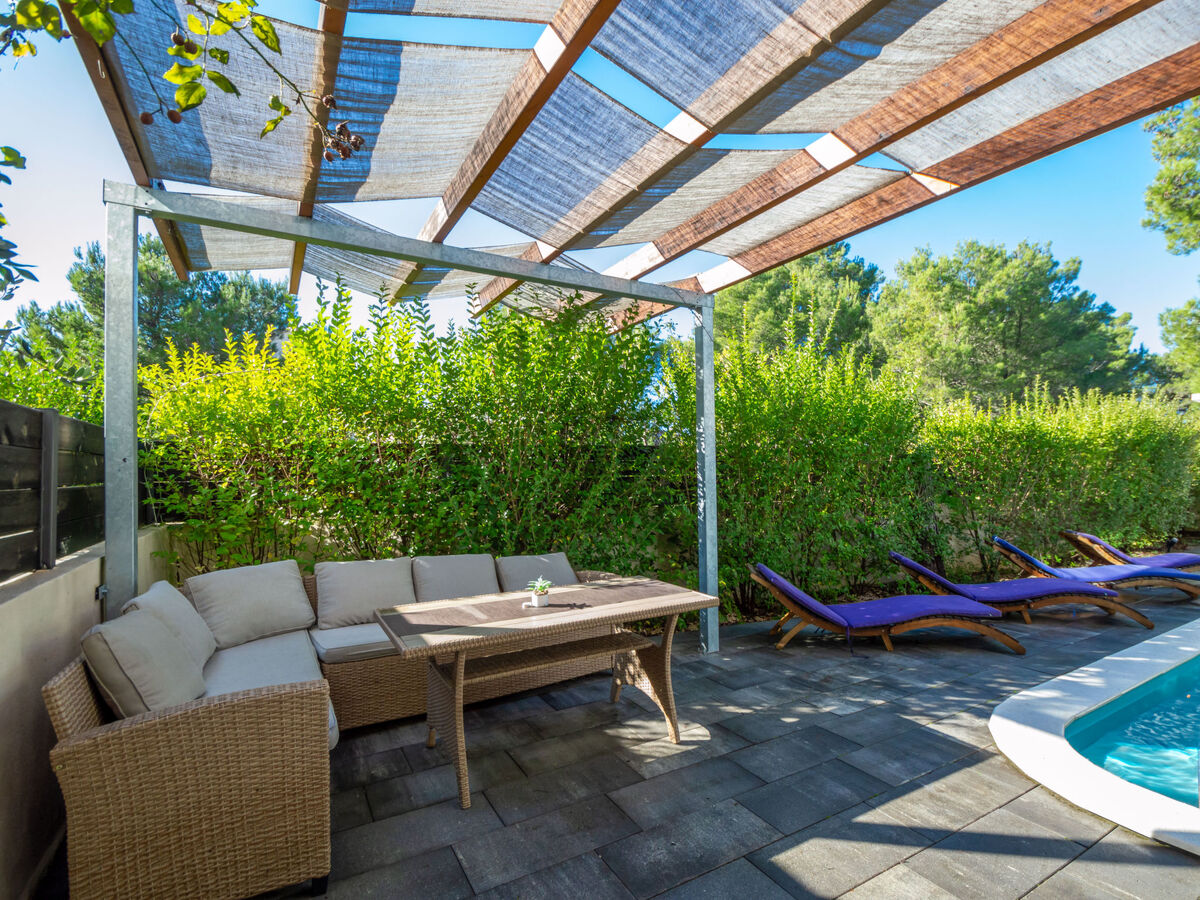 A usage privé: terrain 450 m2 (clôturé), piscine rectangulaire (7 x 3 m, 24 m2, profondeur 150 cm, disponibilité saisonnière: 01.Avr.