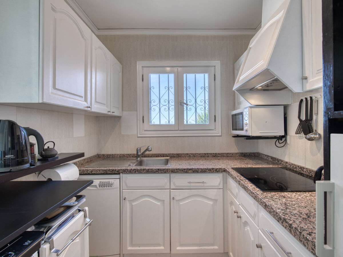 Cuisine ouverte (mini-four, lave-vaisselle, 3 plaques vitrocéramiques, grille-pain, micro-ondes, congélateur, cafetière électrique, combiné micro-ondes).