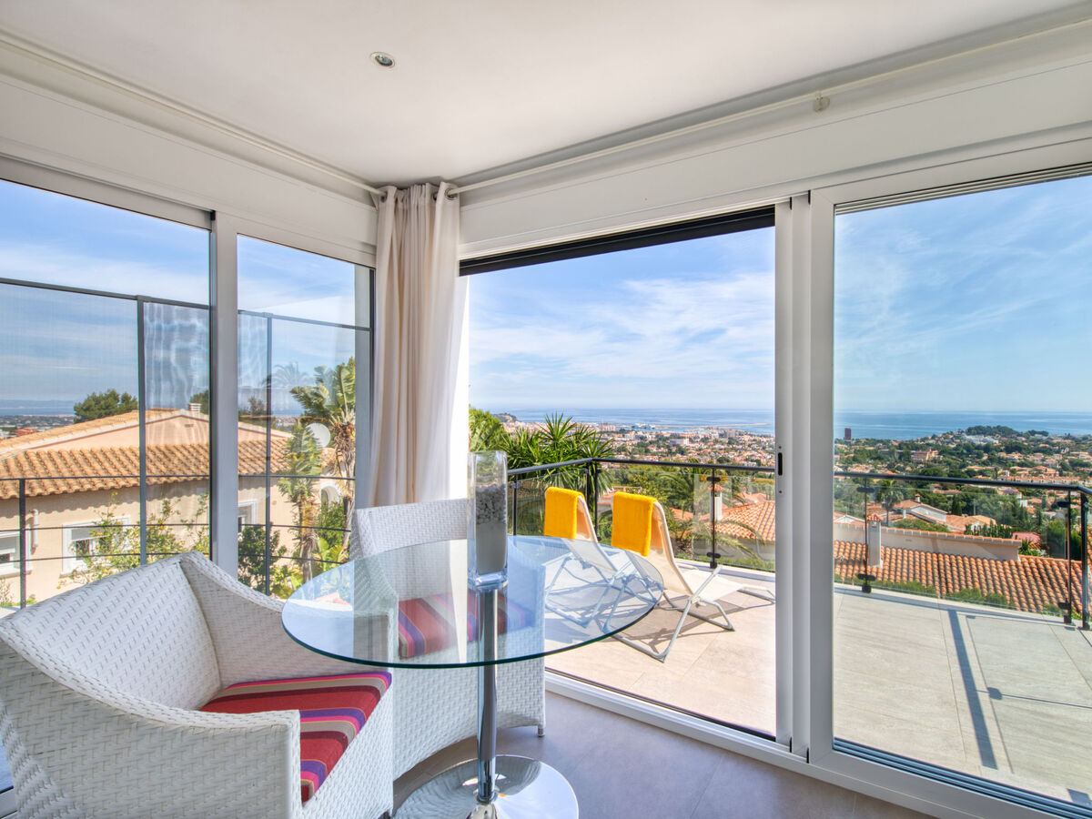 Superbe vue panoramique sur la mer, les montagnes, la piscine et la localité.