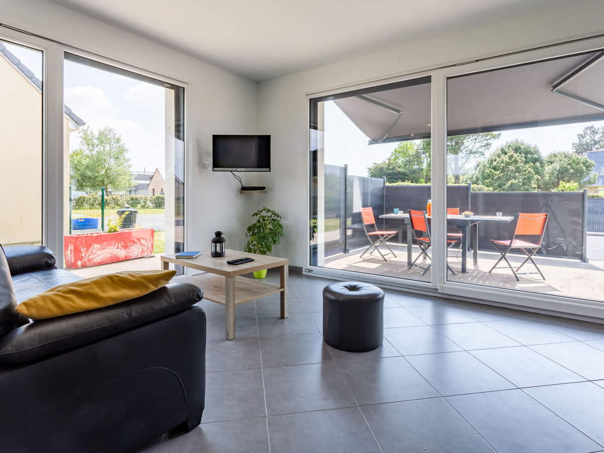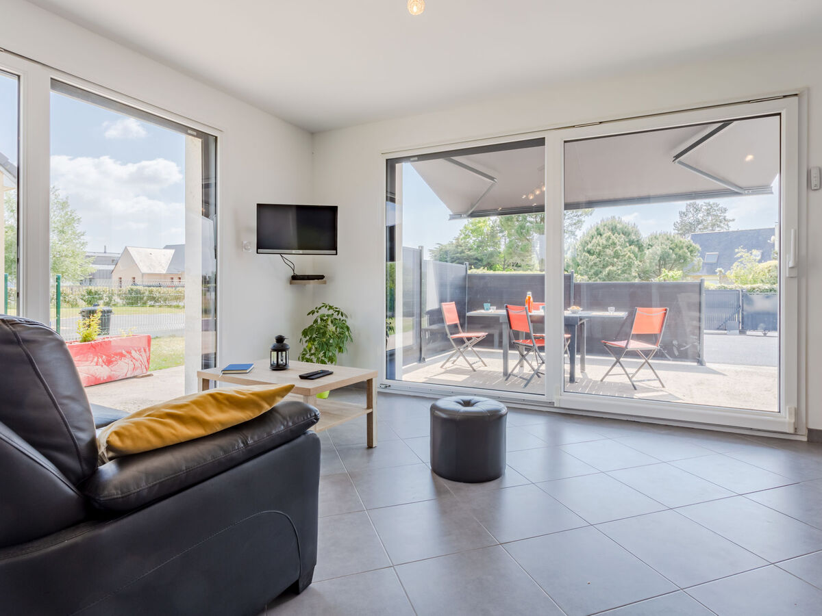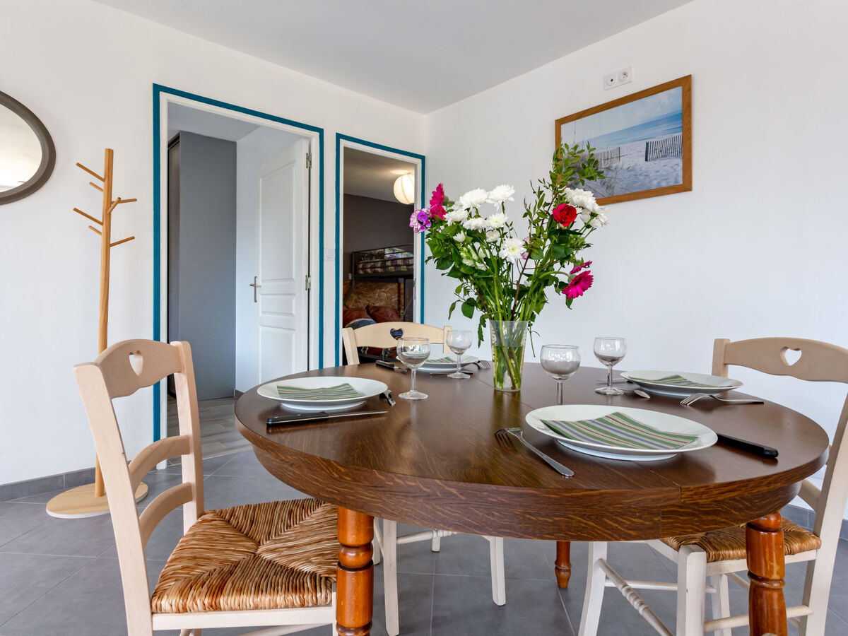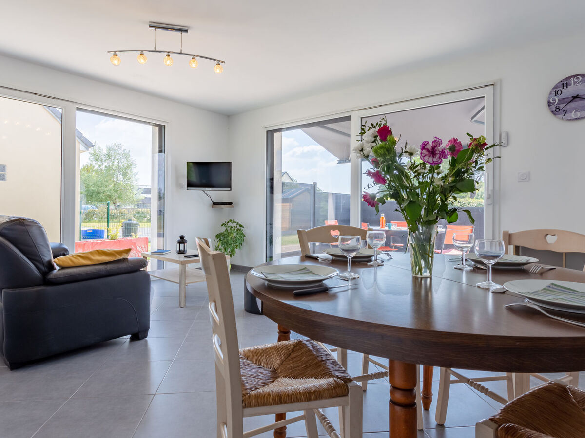 Aménagement confortable et de bon goût: séjour/salle à manger avec table pour les repas, TV et radio.