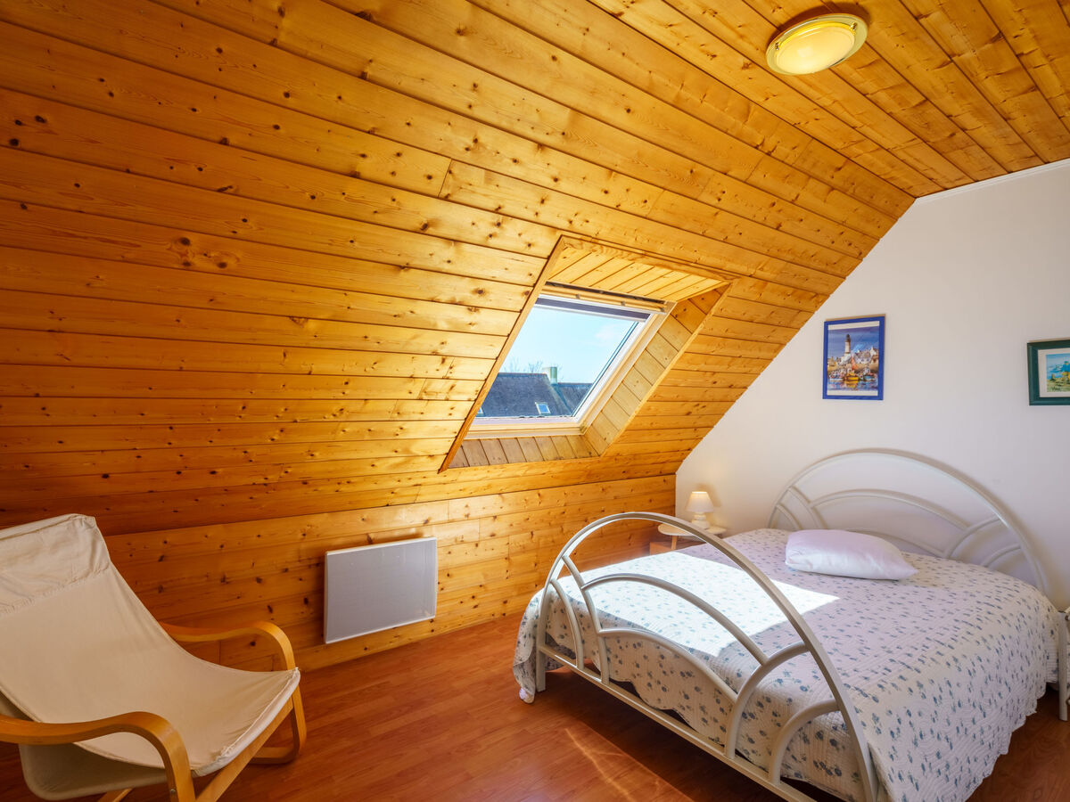 À l'étage supérieur: 1 chambre, mansardée avec fenêtre sous le toit avec 1 grand-lit (140 cm, longueur 190 cm).