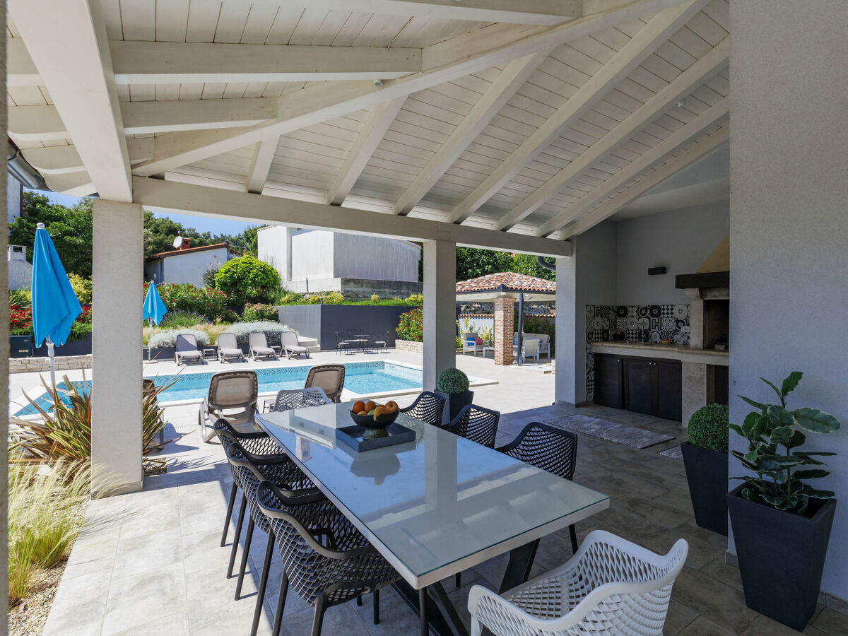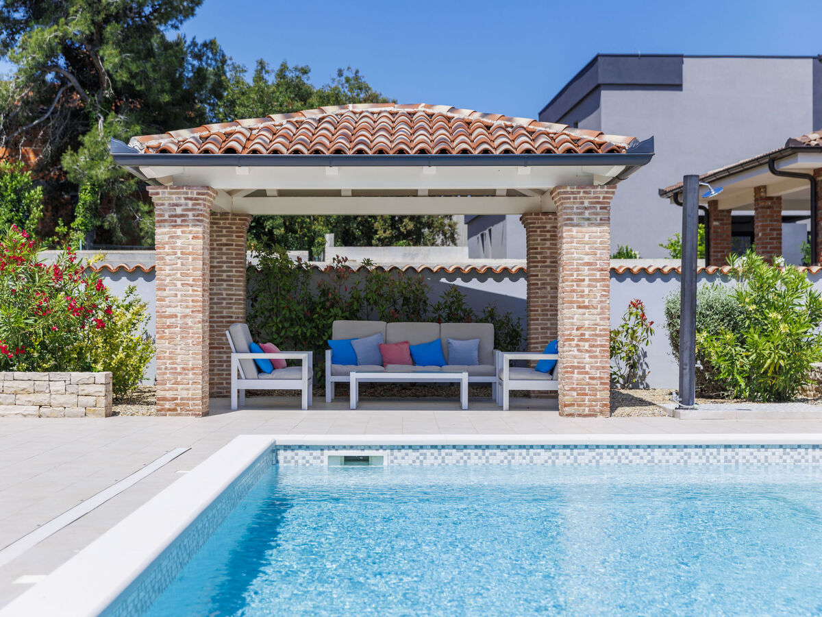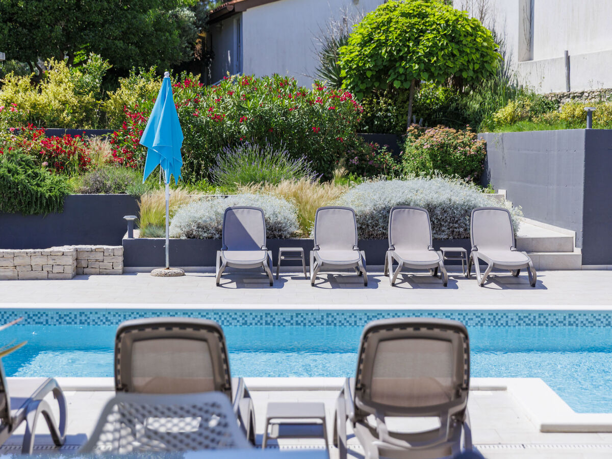 A usage privé: terrain 950 m2 (clôturé), petit jardin avec plantes, piscine chauffée (36 m2, profondeur 140 cm, disponibilité saisonnière: 25.Avr.