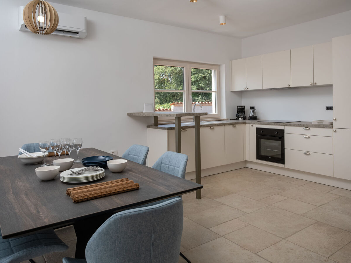 Cuisine ouverte (four, lave-vaisselle, 4 plaques vitrocéramiques, congélateur, cafetière électrique).