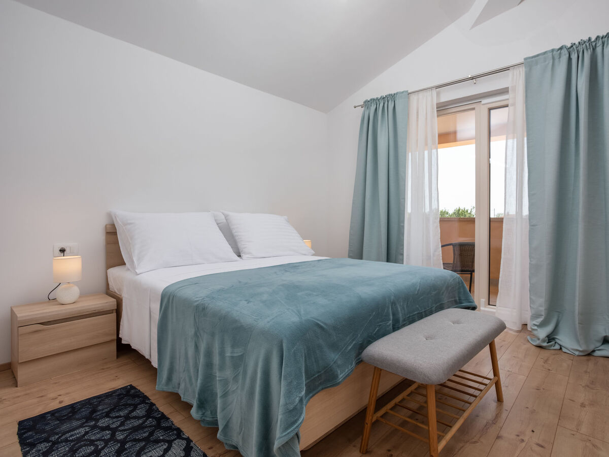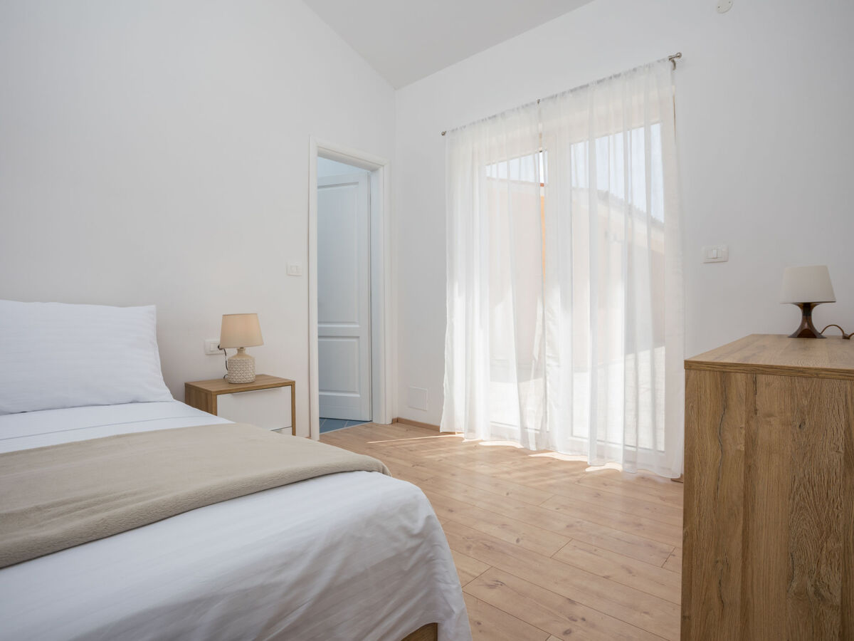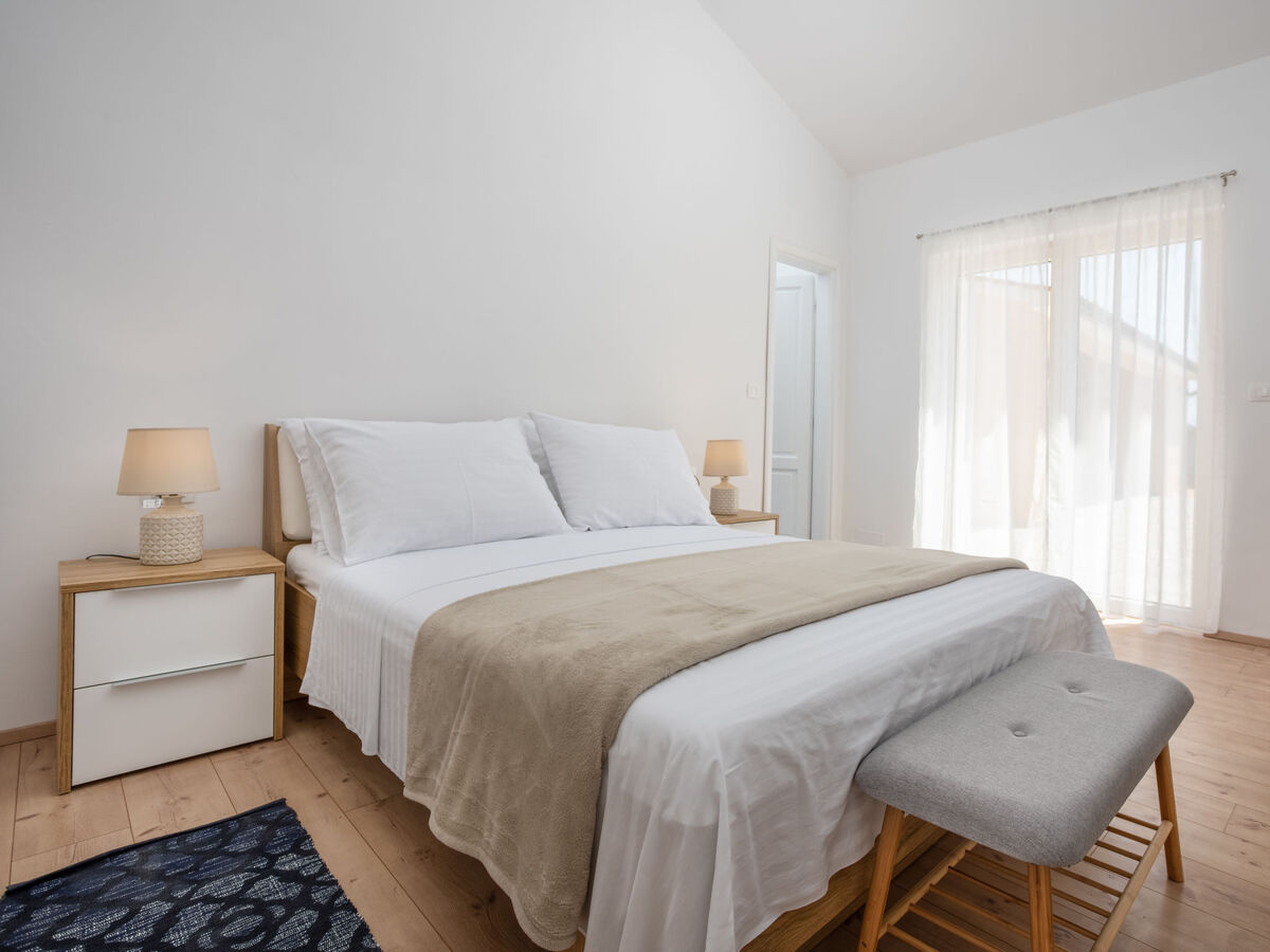 1 chambre avec 1 grand-lit (160 cm, longueur 200 cm), bain/WC et air-conditionné.