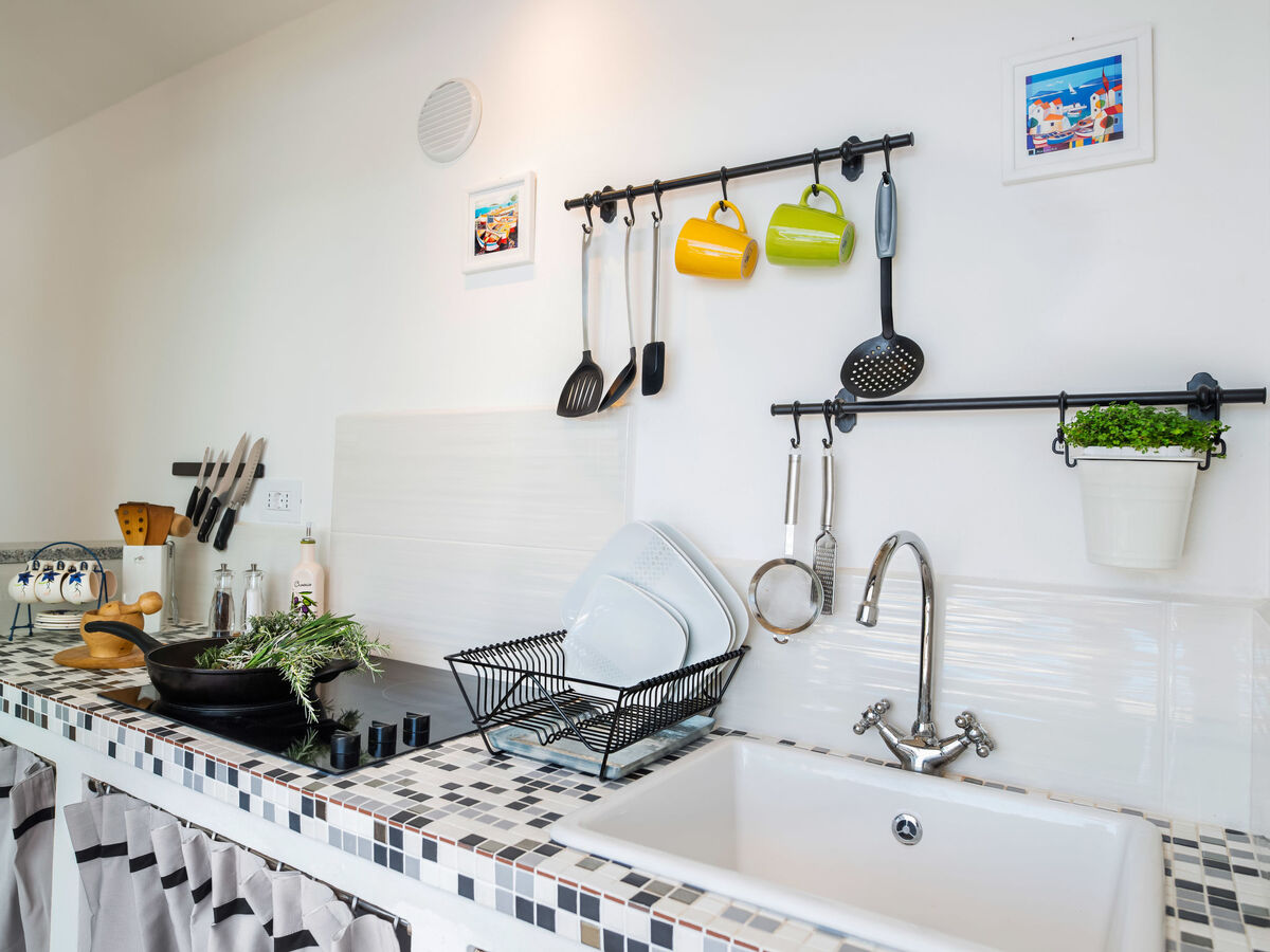 Cuisine ouverte (four, lave-vaisselle, 4 plaques vitrocéramiques, micro-ondes, congélateur, cafetière électrique).