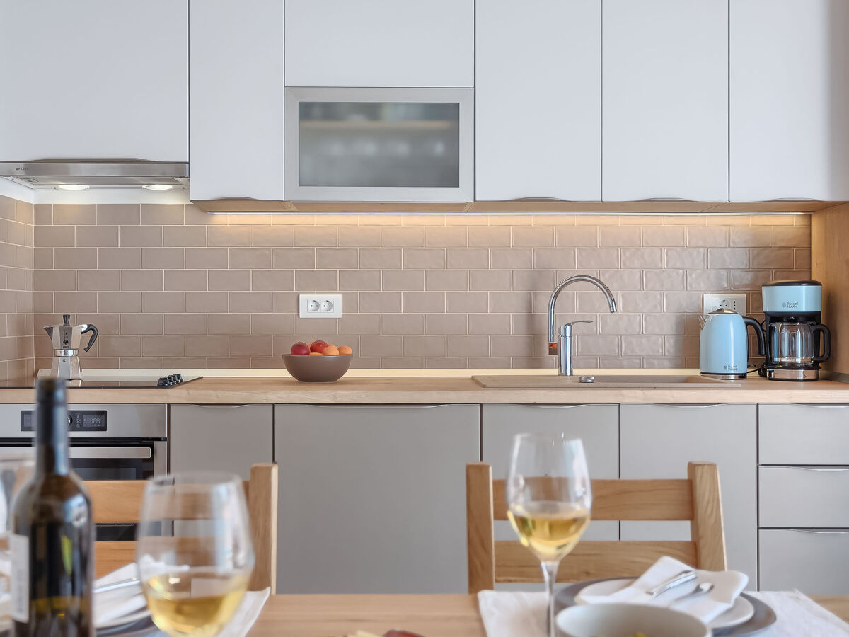 Cuisine ouverte (four, lave-vaisselle, 4 plaques vitrocéramiques, micro-ondes, congélateur, cafetière électrique).