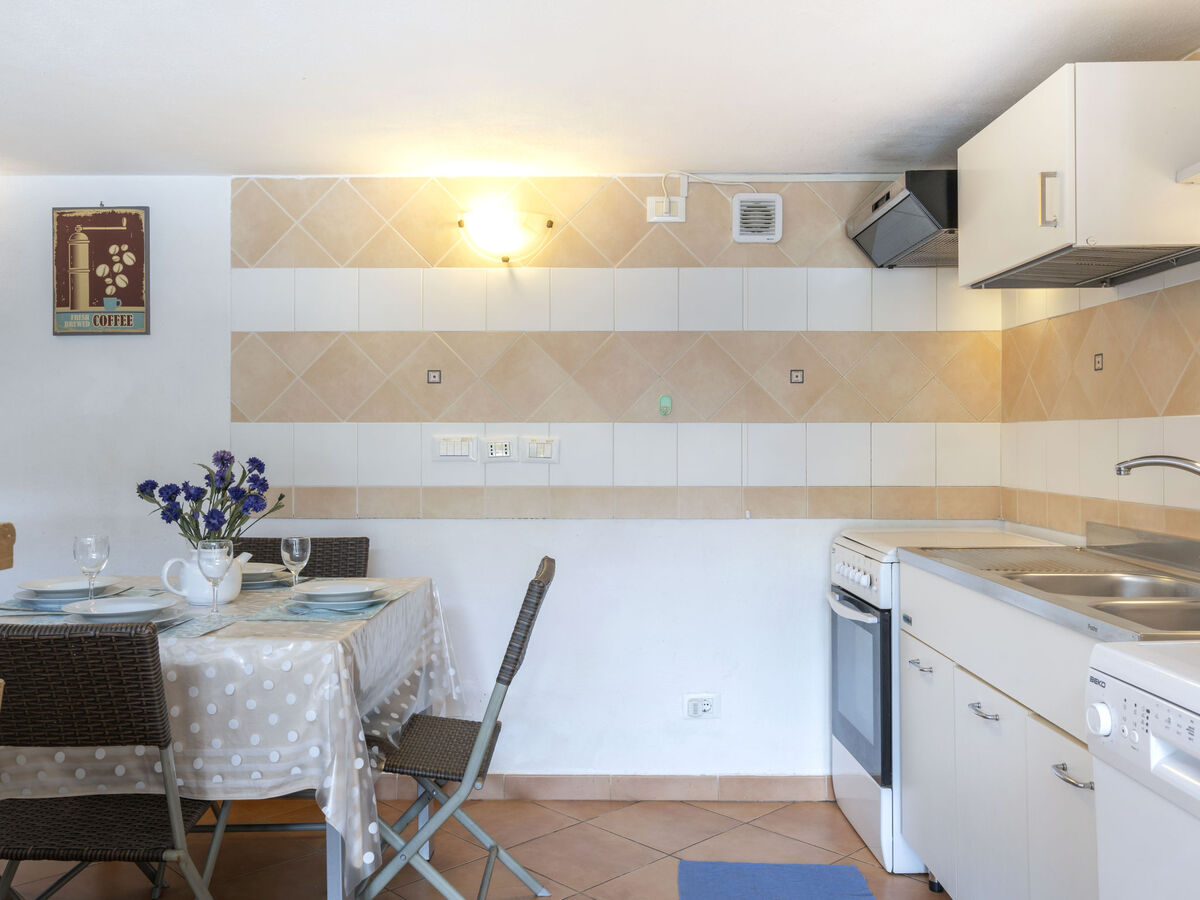Cuisine ouverte (four, lave-vaisselle, 4 feux, grille-pain, bouilloire électrique, micro-ondes, congélateur, cafetière électrique) avec petite table pour les repas.