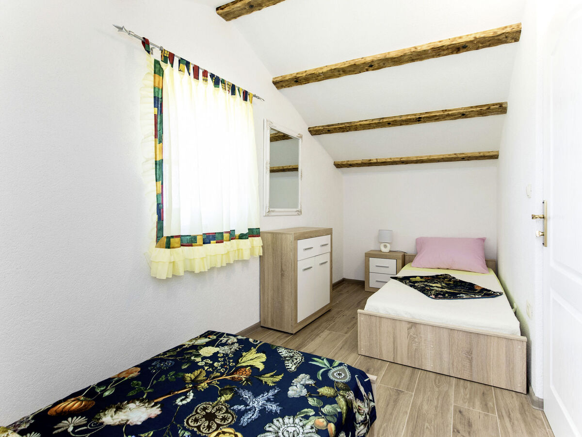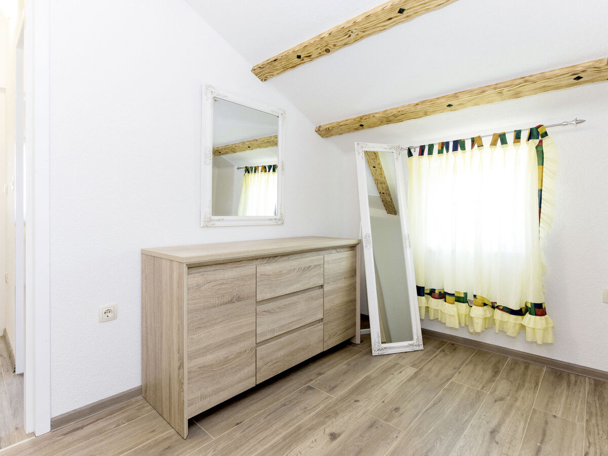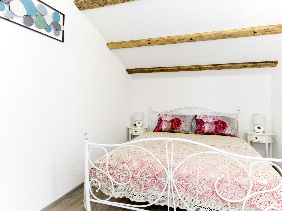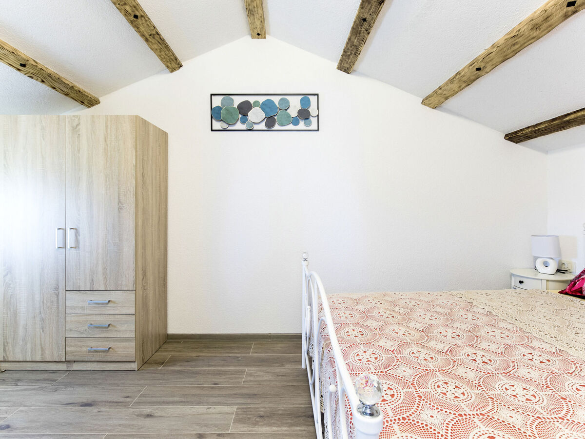 À l'étage supérieur: (escalier sans rampe) 1 chambre, mansardée avec 1 grand-lit (160 cm).