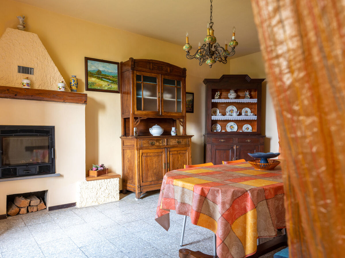 Salle à manger avec cheminée et table pour les repas.