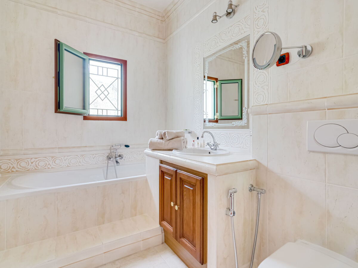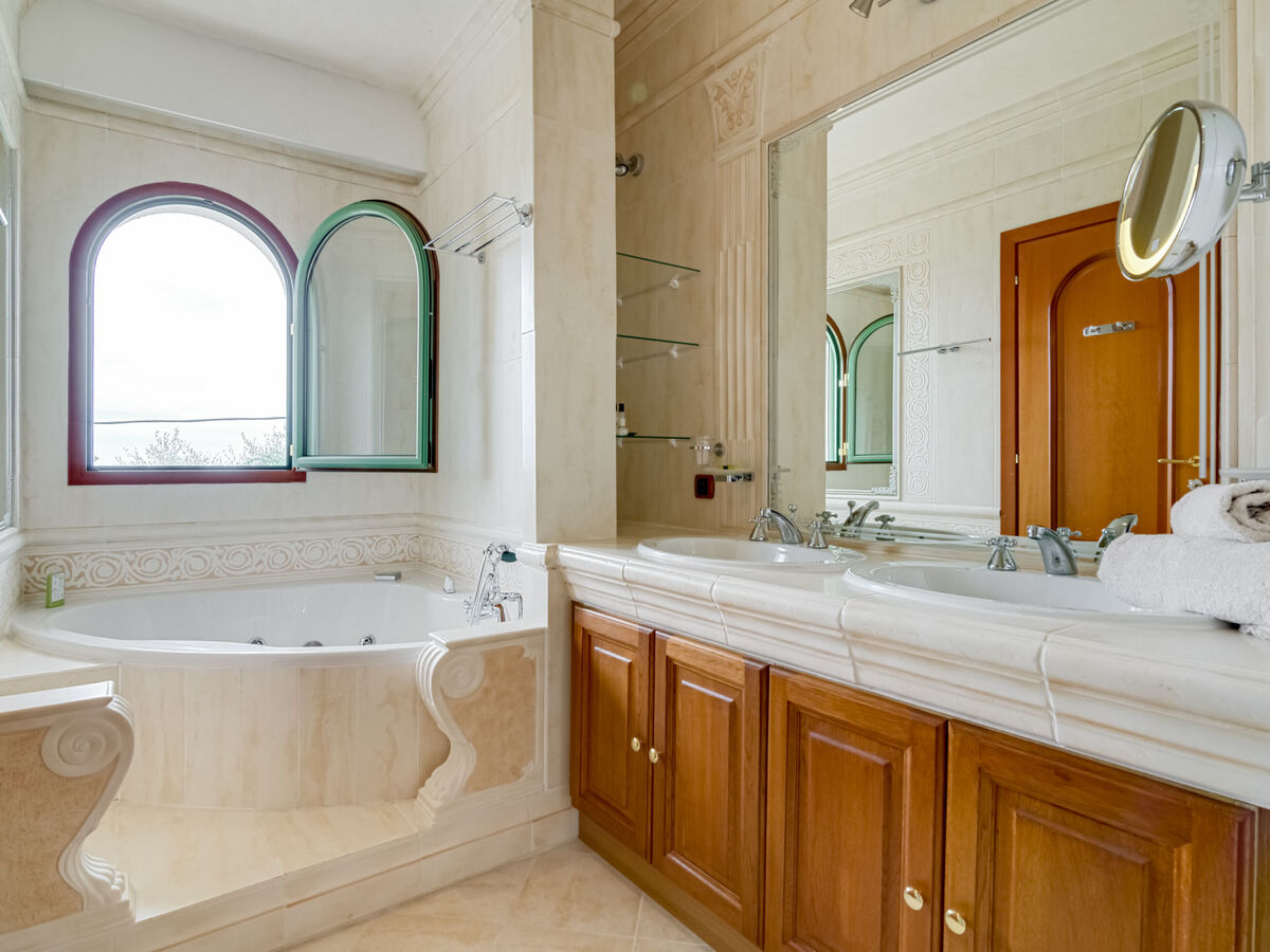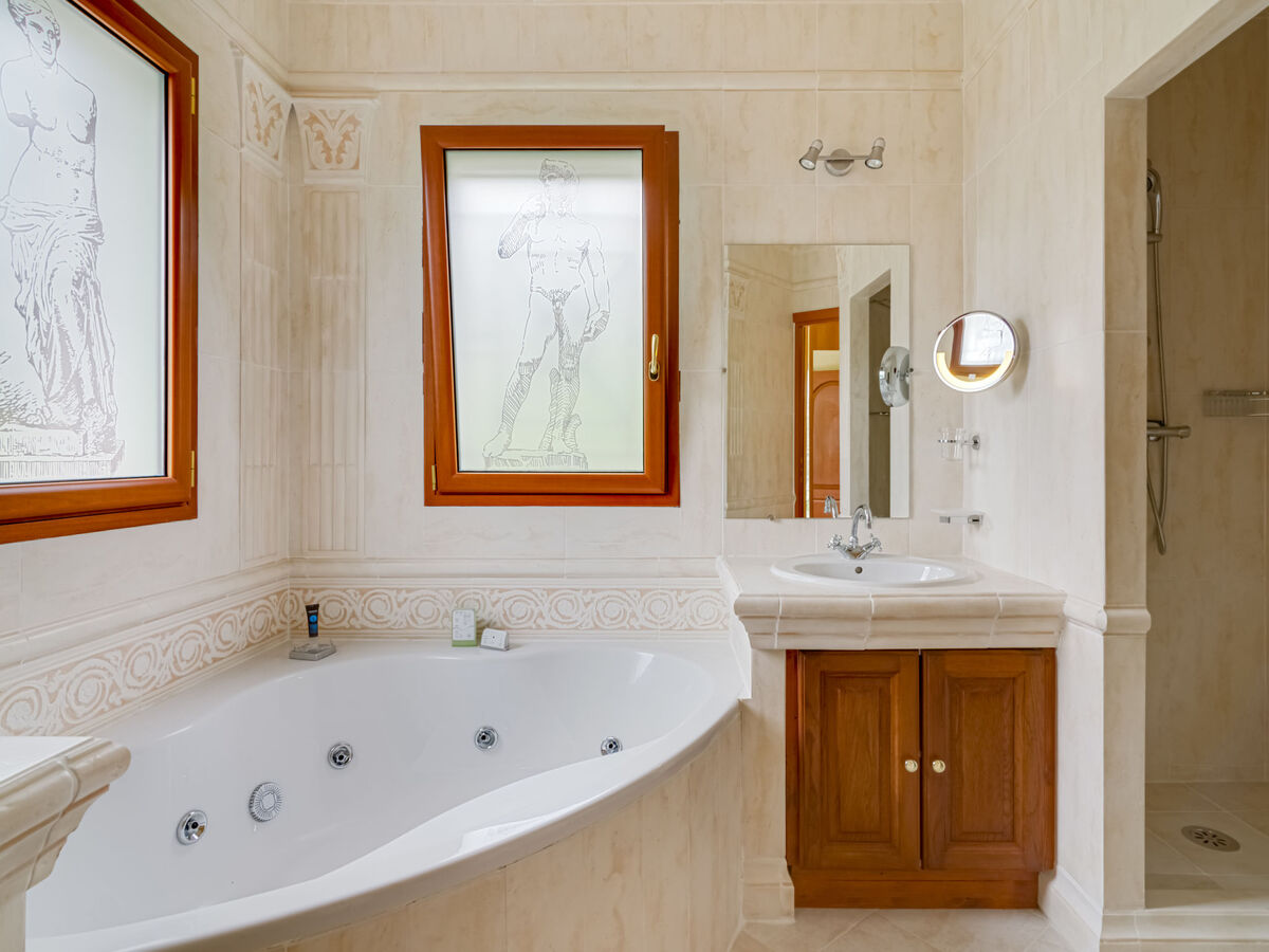 1 chambre avec 1 grand-lit (160 cm, longueur 200 cm), bain/douche/WC, double vasque, avec baignoire d'angle et air-conditionné.