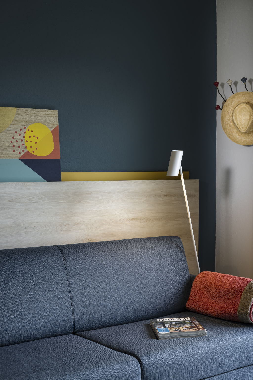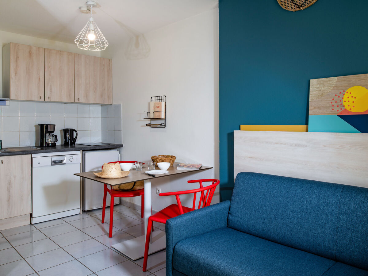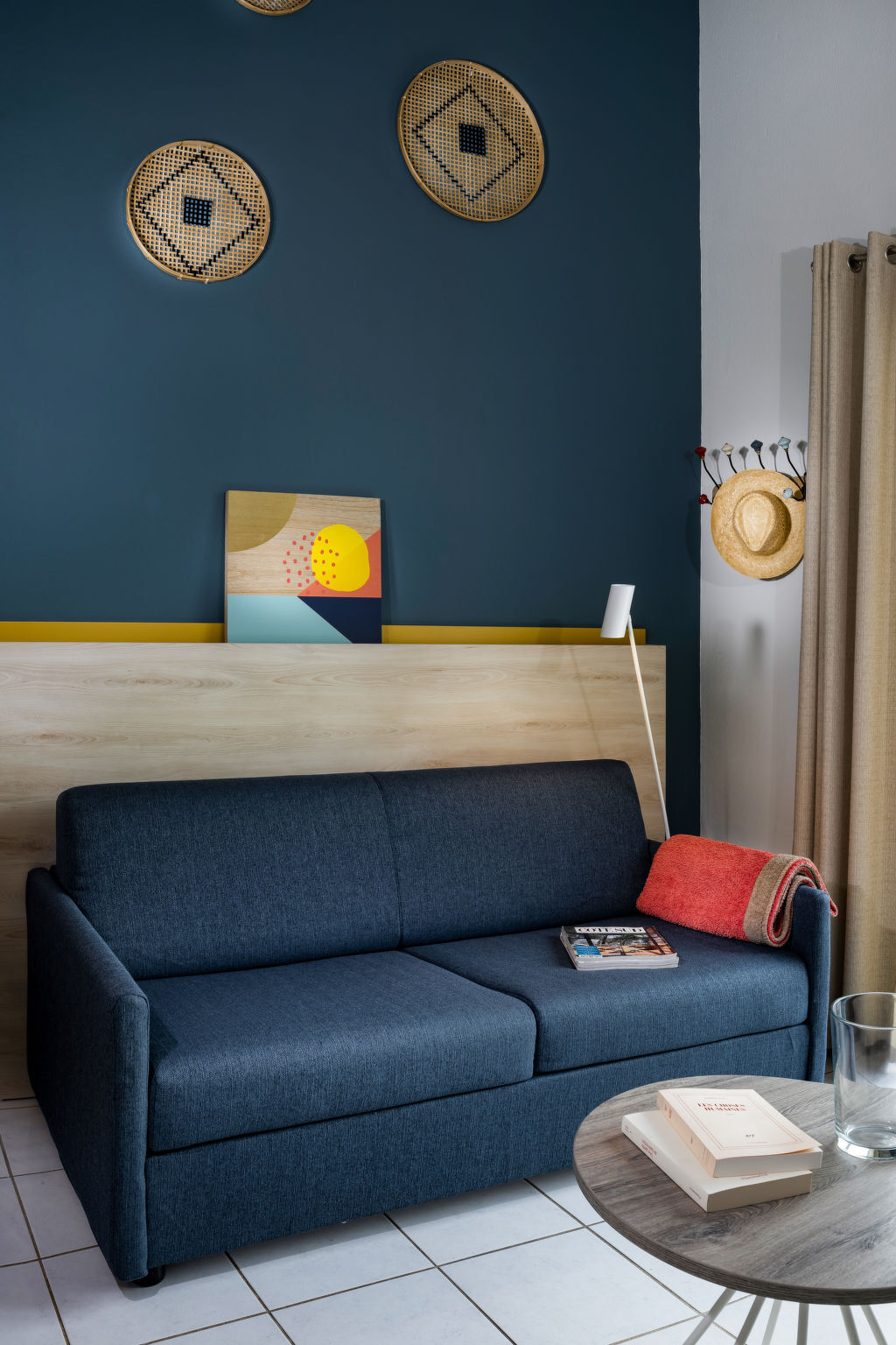 Clair, rénovée en 2019, aménagement moderne et de style: séjour/chambre à coucher avec 1 divan-lit double (140 cm, longueur 190 cm), table pour les repas, TV et air-conditionné.