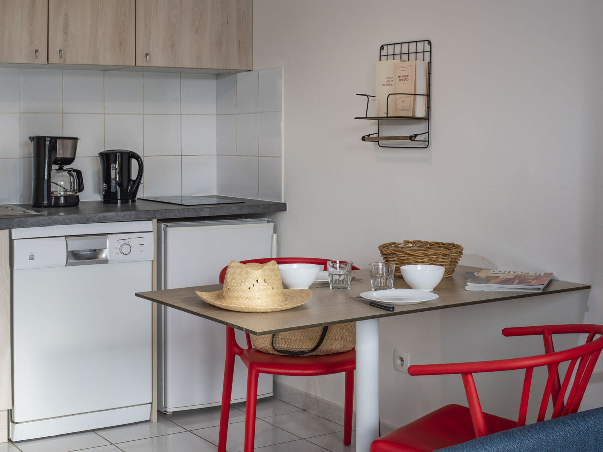 Coin cuisine (2 plaques de cuisson, lave-vaisselle, micro-ondes, cafetière électrique).