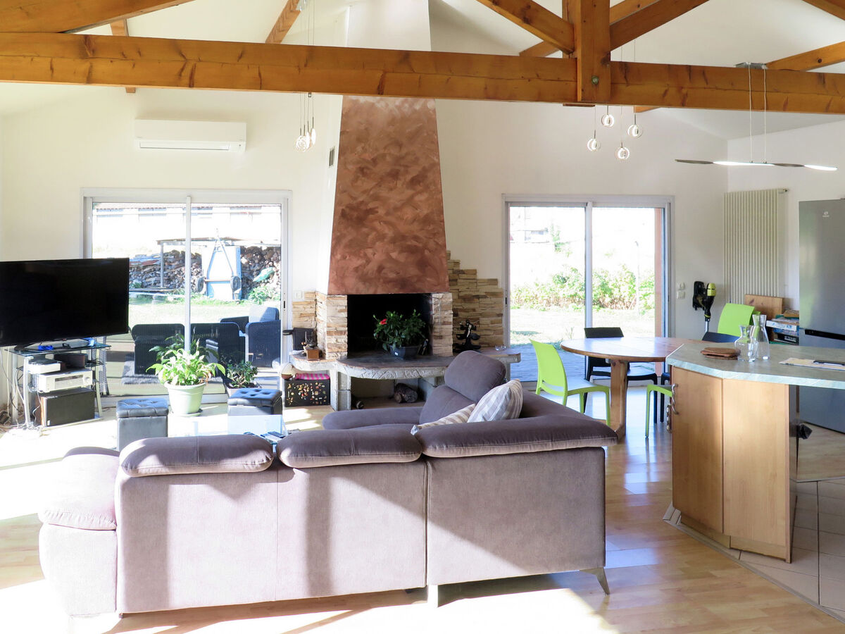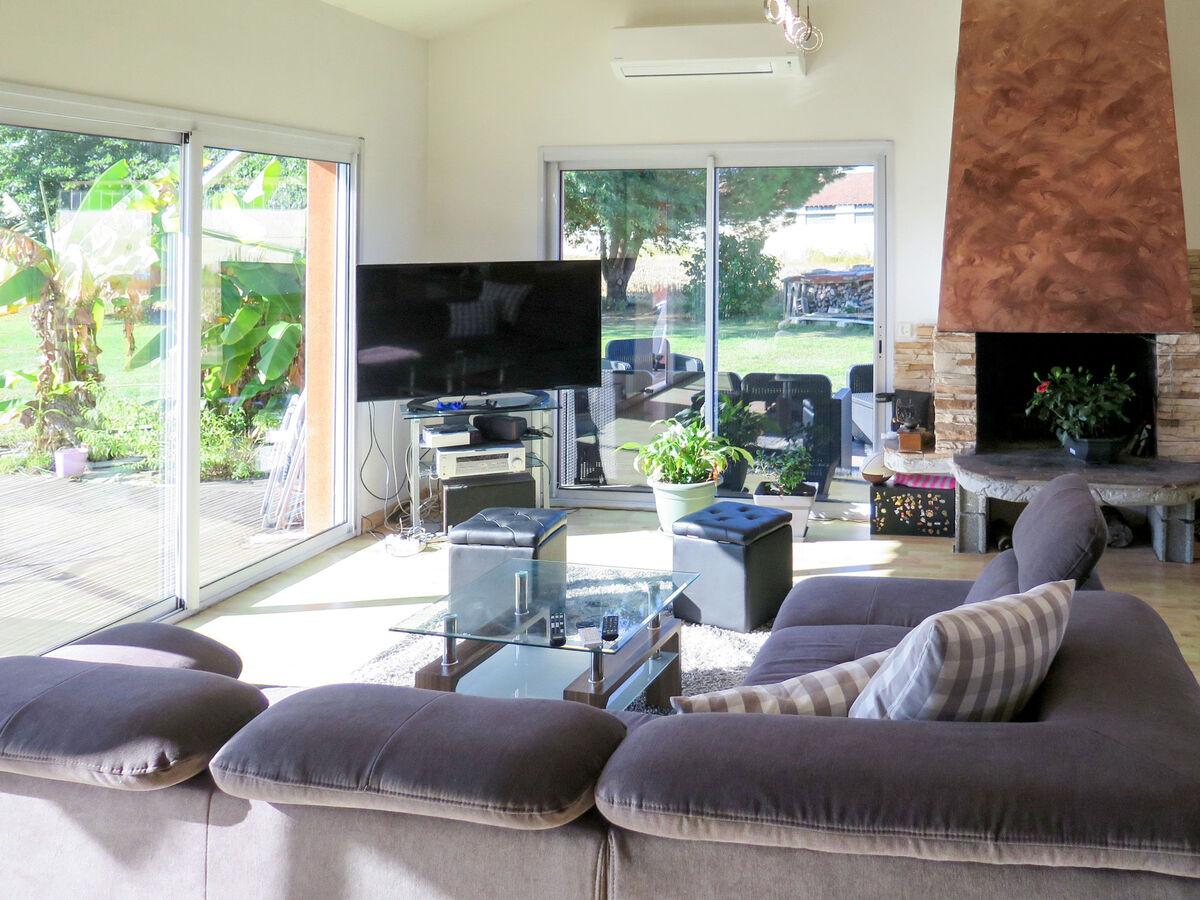 Clair, aménagement agréable: séjour/salle à manger avec baie vitrée avec cheminée, table pour les repas, TV (satellite) et chaînes de TV internationales (écran plat), radio.