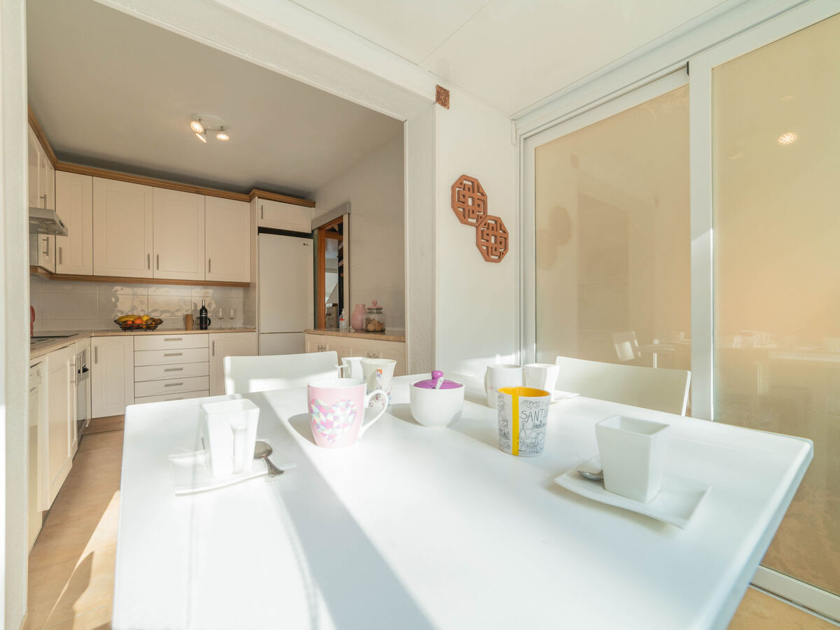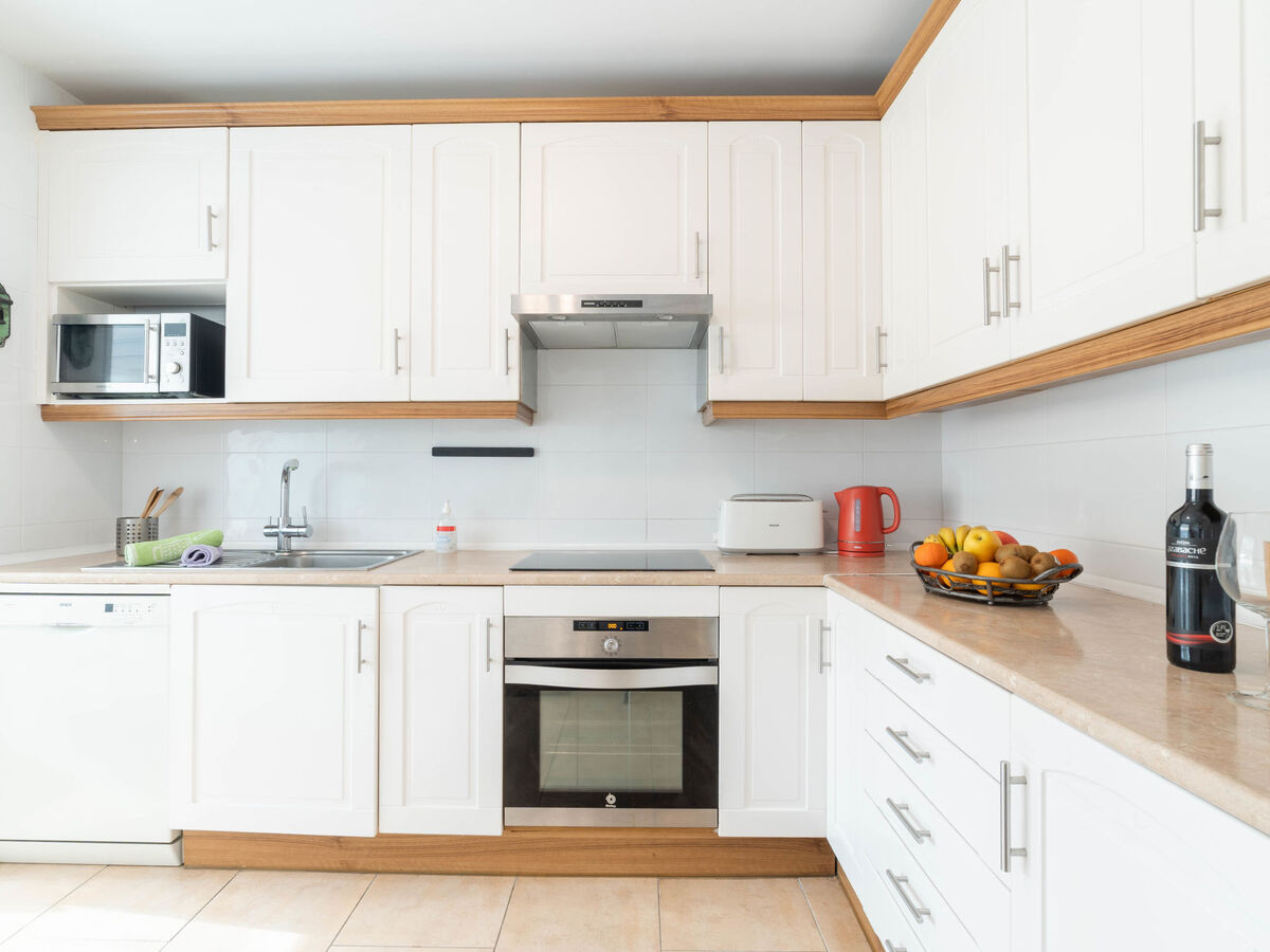 Cuisine (lave-vaisselle, 3 plaques vitrocéramiques, micro-ondes, congélateur, cafetière électrique) avec table pour les repas.