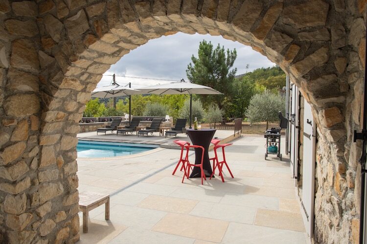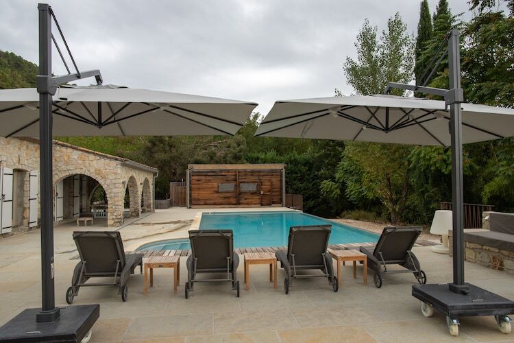 Autour de la piscine, vous trouverez une terrasse avec des bancs en pierre naturelle, ainsi que des chaises longues, des meubles de jardin et des parasols.