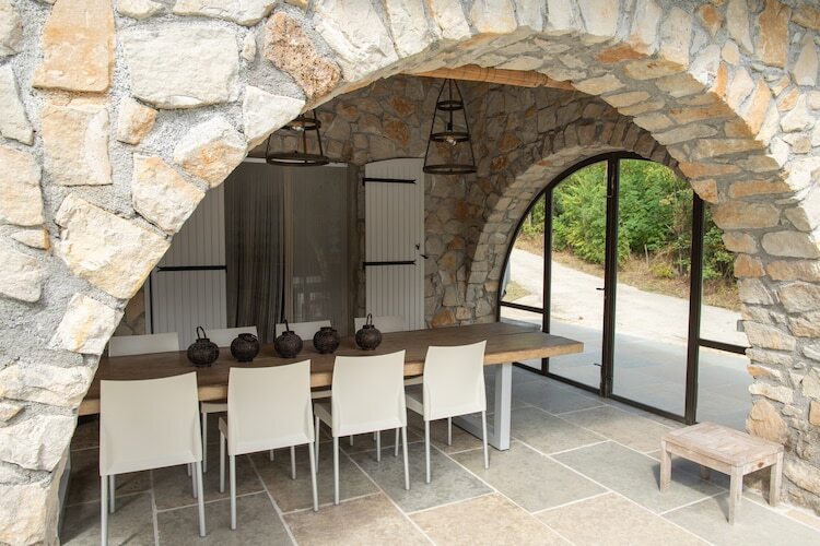 Adjacente à la maison, une terrasse couverte de pierres avec une grande table en chêne pouvant accueillir 12 personnes.