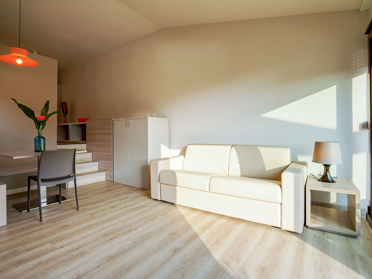 Clair, rénovée en 2019, aménagement moderne: séjour/chambre à coucher avec 1 divan-lit double (140 cm), coin repas et TV.