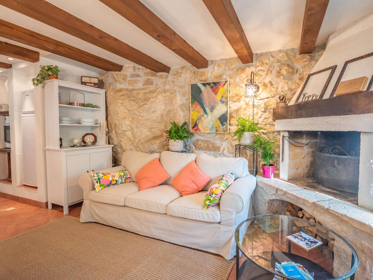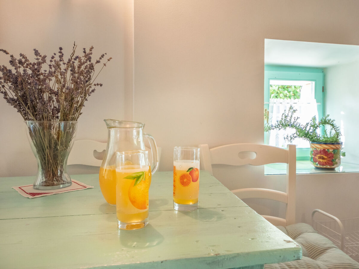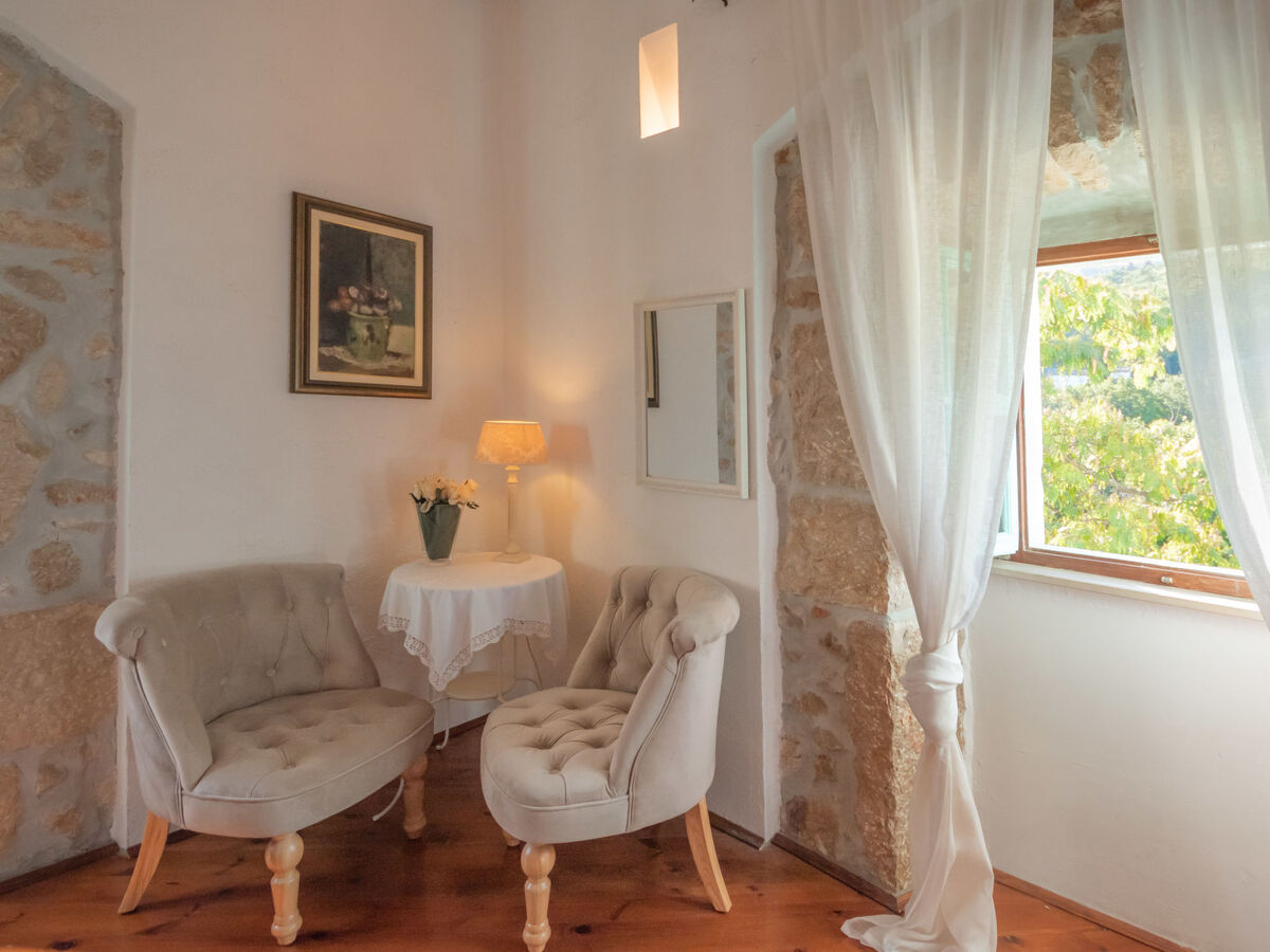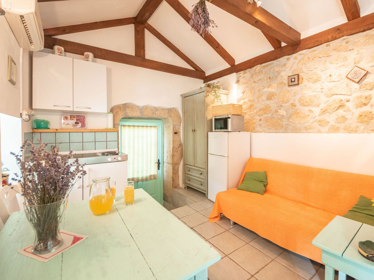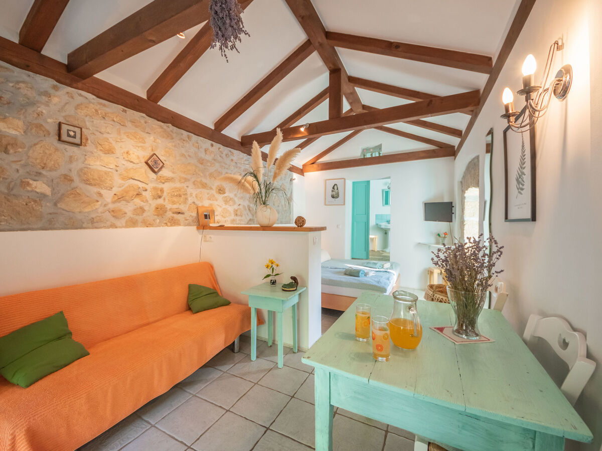 Aménagement rustique: séjour/chambre à coucher 30 m2 avec 1 divan-lit (100 cm, longueur 180 cm), 1 lit double (2 x 90 cm, longueur 200 cm), table pour les repas, coin-cuisine, bain/WC, TV (satellite) et air-conditionné.