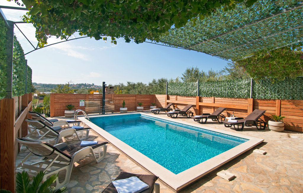Bien-être à l'extérieur : Location de vacances disposant de chaises-longues et d'un ou plusieurs équipements tels que piscine extérieure, jacuzzi extérieur, lit à baldaquin de jardin etc...