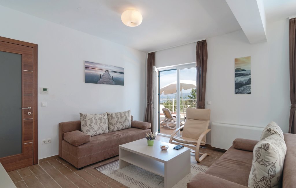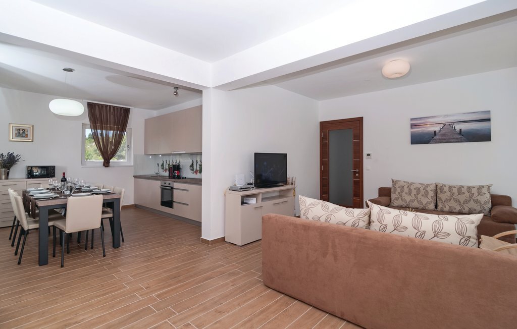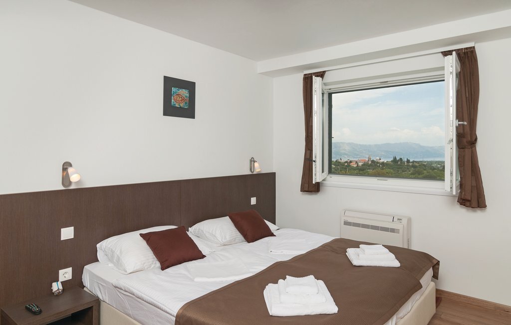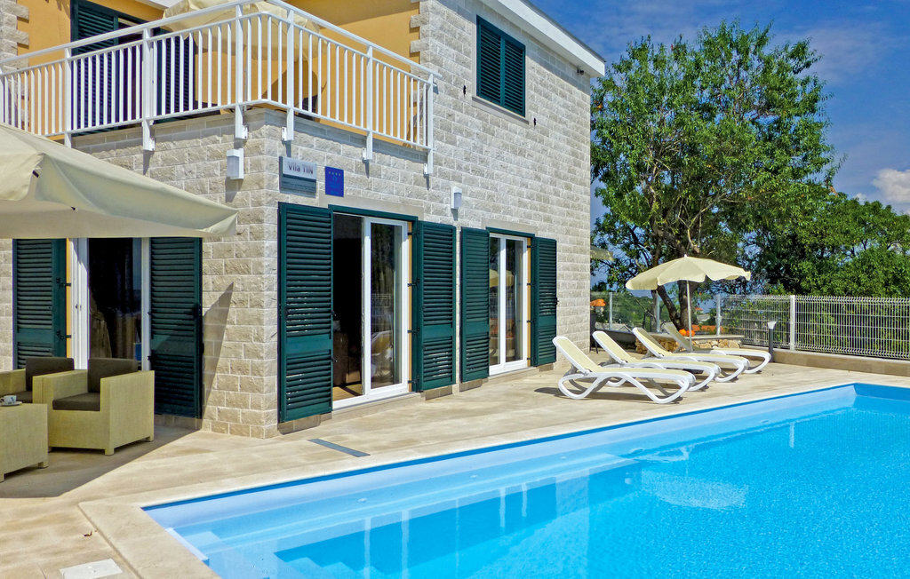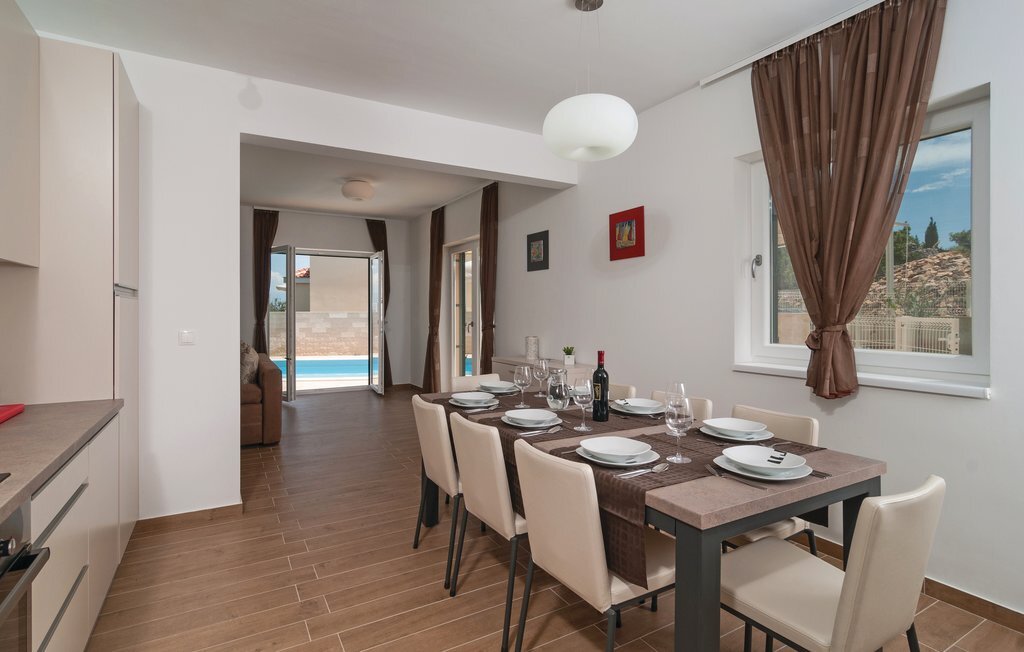 Cette belle maison de vacances se trouve dans le village pittoresque et aussi le plus ancien de Brac, à Skrip. De l'extérieur, un style dalmate traditionnel avec les célèbres pierres de Brac vous attend, tandis que l'intérieur est décoré avec un mobilier moderne. La maison s'étend sur deux étages. Depuis le salon du rez-de-chaussée, on accède au solarium avec piscine et il y a également une belle terrasse avec des tables et des chaises pour se réunir confortablement. Les terrasses du premier étage offrent une vue imprenable sur la mer. La ville est ornée de tours romaines et de toits blancs, d'une architecture rurale, et le musée de l'île de Brac vous initiera aux 3000 ans d'histoire du village de Skrip. Le CDB503 se trouve à environ 20 m de la maison. Un chemin de terre de 100 m mène à la maison.