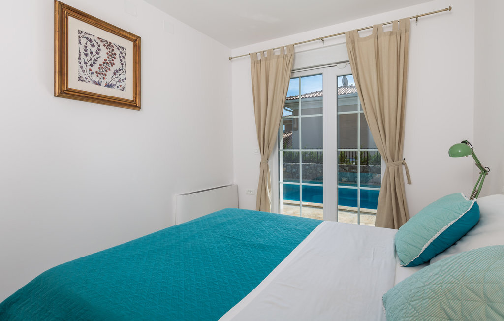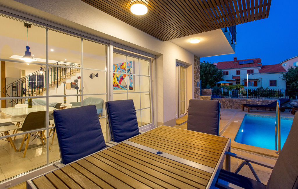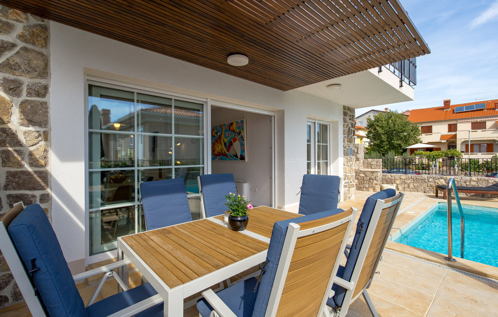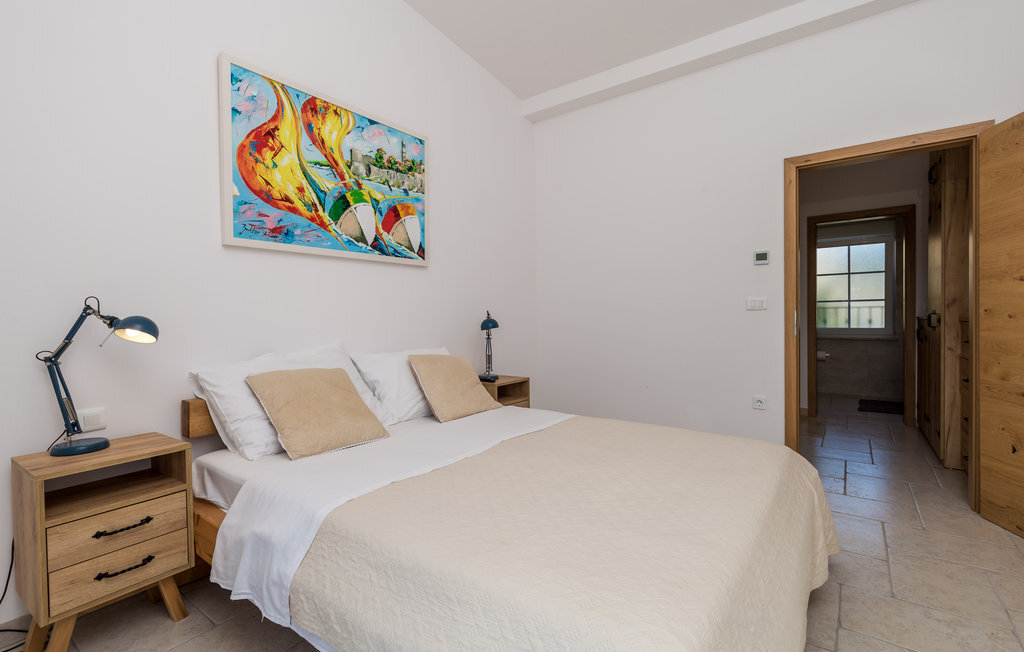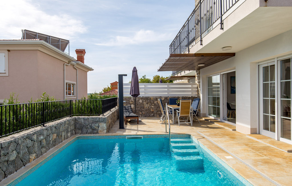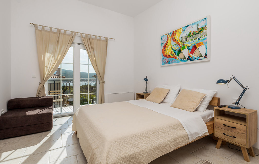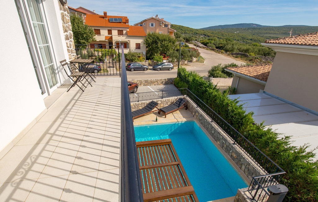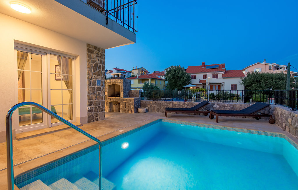 Sur l'île de Krk, dans le petit village de Korni, se trouve cette magnifique maison de vacances avec piscine. Elle se trouve à environ cinq minutes en voiture de la ville historique de Krk et de la ville de Punat avec son port bien protégé. Grâce à sa situation sur une colline, la maison offre une vue fantastique sur la mer et les oliveraies, pour lesquelles la région est connue. La maison, aménagée avec l'amour du détail, est construite selon l'architecture typique de l'île et se compose d'un mélange réussi d'éléments modernes et traditionnels. Depuis le salon, vous avez un accès direct à la terrasse avec barbecue, espace salon et soleil ainsi que piscine chauffée. La chambre à coucher principale se trouve au rez-de-chaussée et les deux autres sont à l'étage. La maison est climatisée, dispose d'un chauffage au sol et sur le grand terrain clôturé se trouvent également les places de parking.