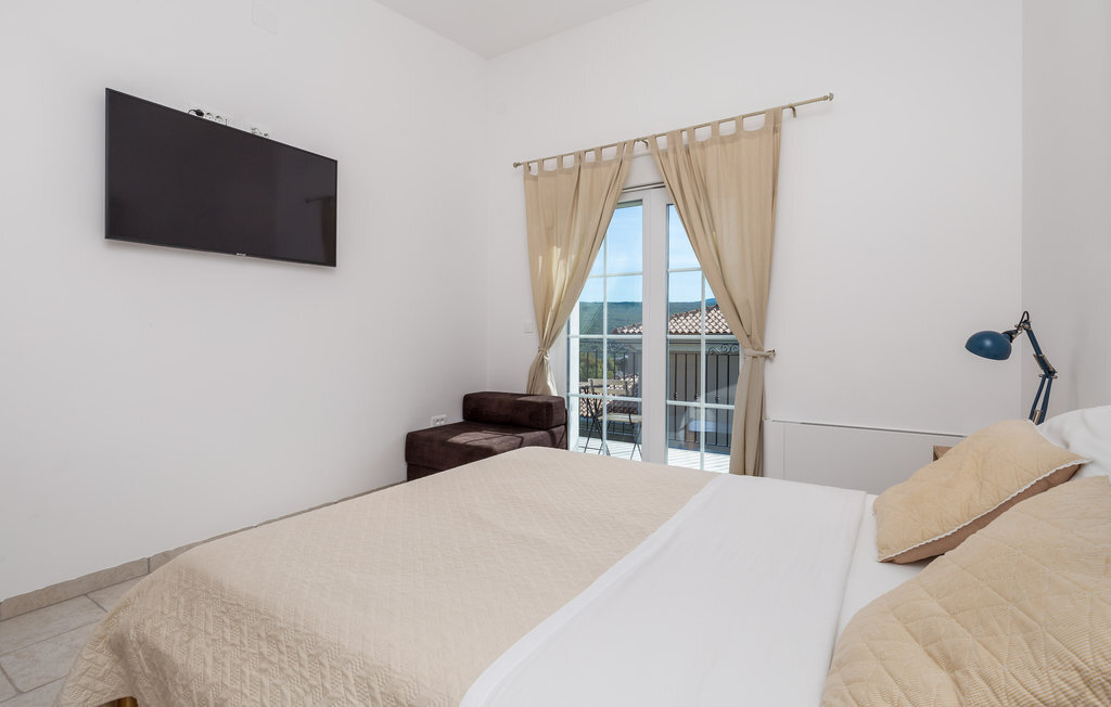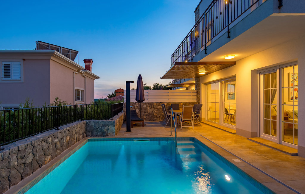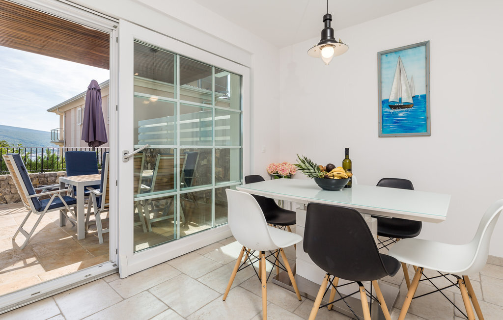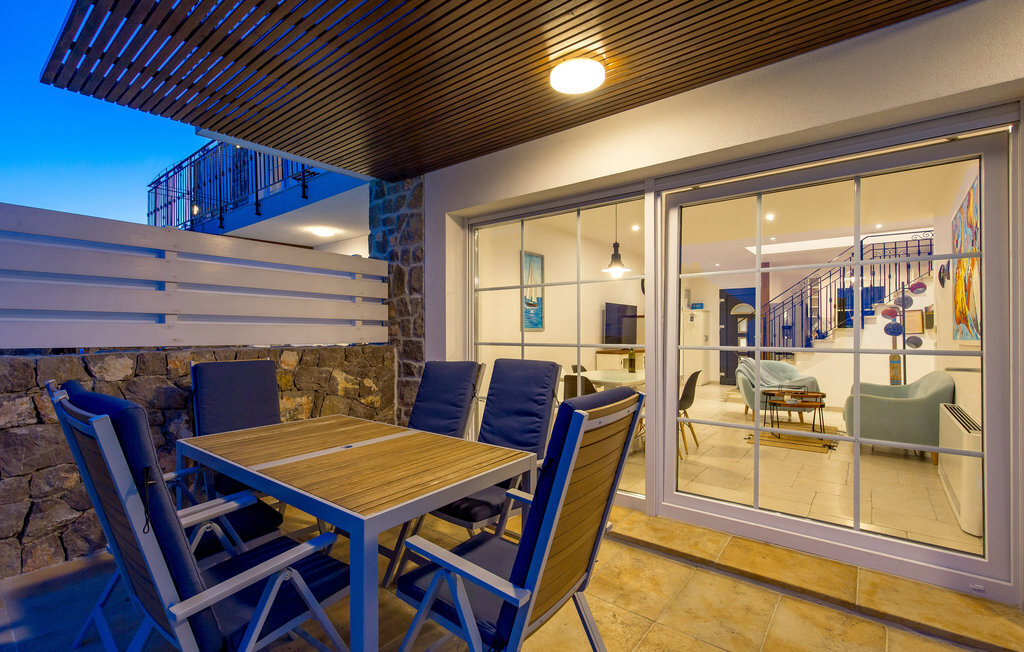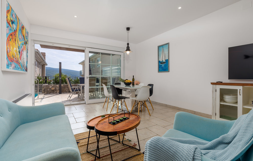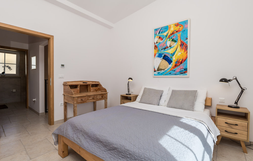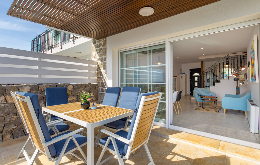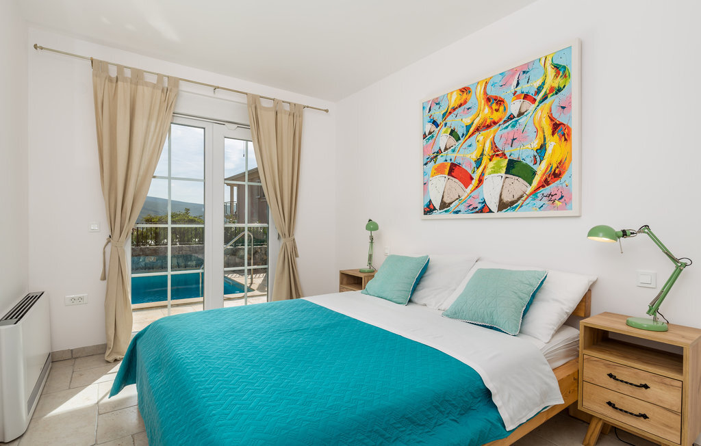 Sur l'île de Krk, dans le petit village de Korni, se trouve cette magnifique maison de vacances avec piscine. Elle se trouve à environ cinq minutes en voiture de la ville historique de Krk et de la ville de Punat avec son port bien protégé. Grâce à sa situation sur une colline, la maison offre une vue fantastique sur la mer et les oliveraies, pour lesquelles la région est connue. La maison, aménagée avec l'amour du détail, est construite selon l'architecture typique de l'île et se compose d'un mélange réussi d'éléments modernes et traditionnels. Depuis le salon, vous avez un accès direct à la terrasse avec barbecue, espace salon et soleil ainsi que piscine chauffée. La chambre à coucher principale se trouve au rez-de-chaussée et les deux autres sont à l'étage. La maison est climatisée, dispose d'un chauffage au sol et sur le grand terrain clôturé se trouvent également les places de parking.