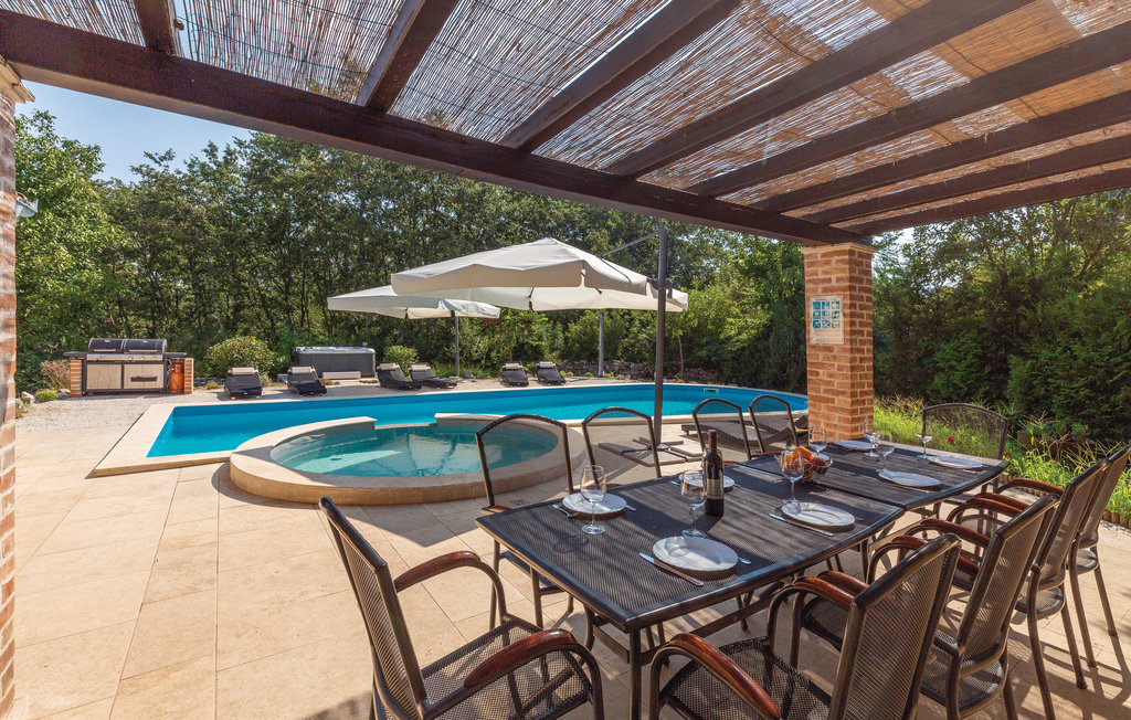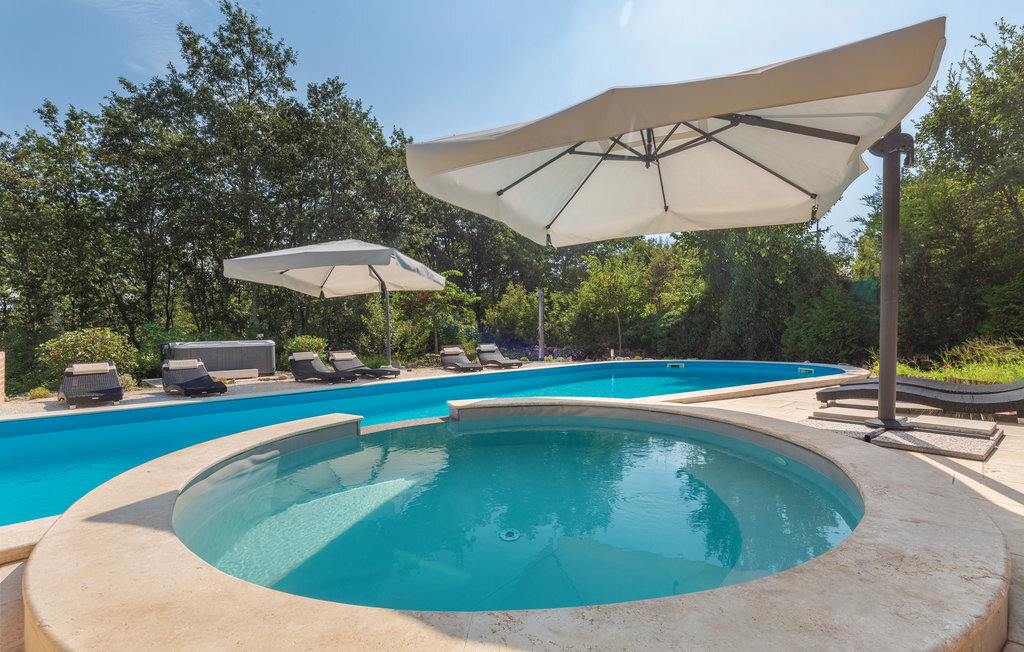 Bien-être à l'extérieur : Location de vacances disposant de chaises-longues et d'un ou plusieurs équipements tels que piscine extérieure, jacuzzi extérieur, lit à baldaquin de jardin etc...