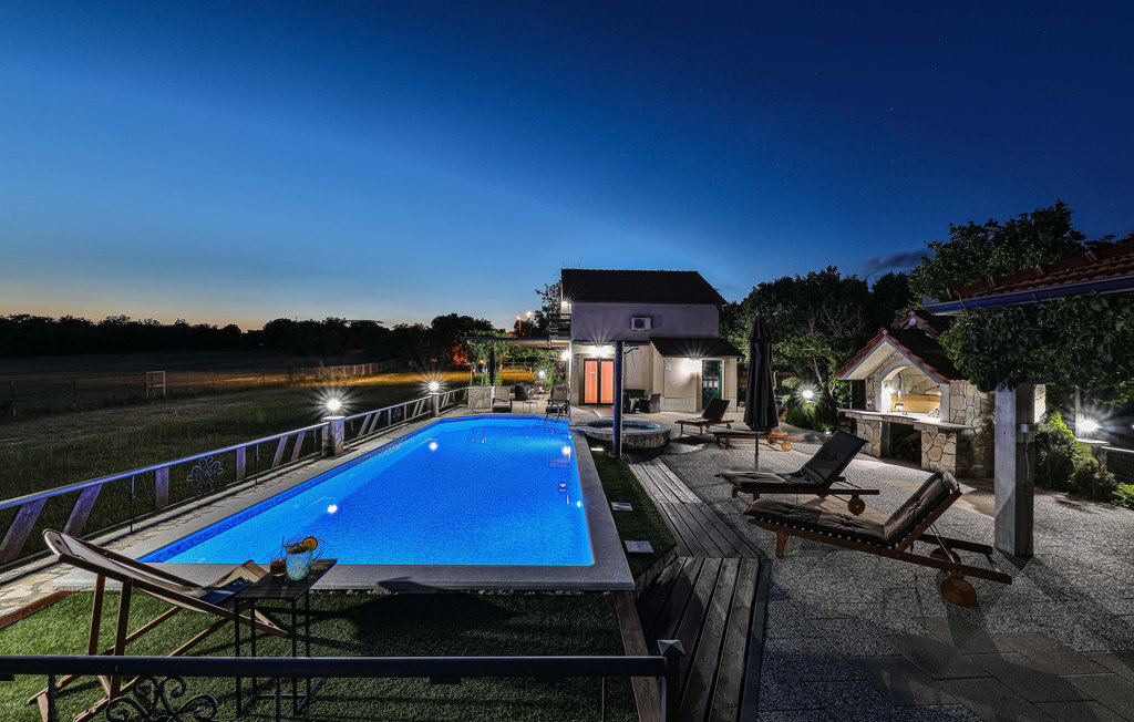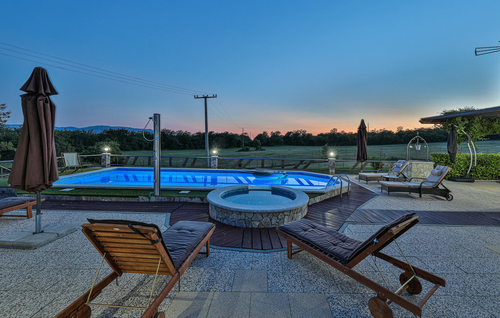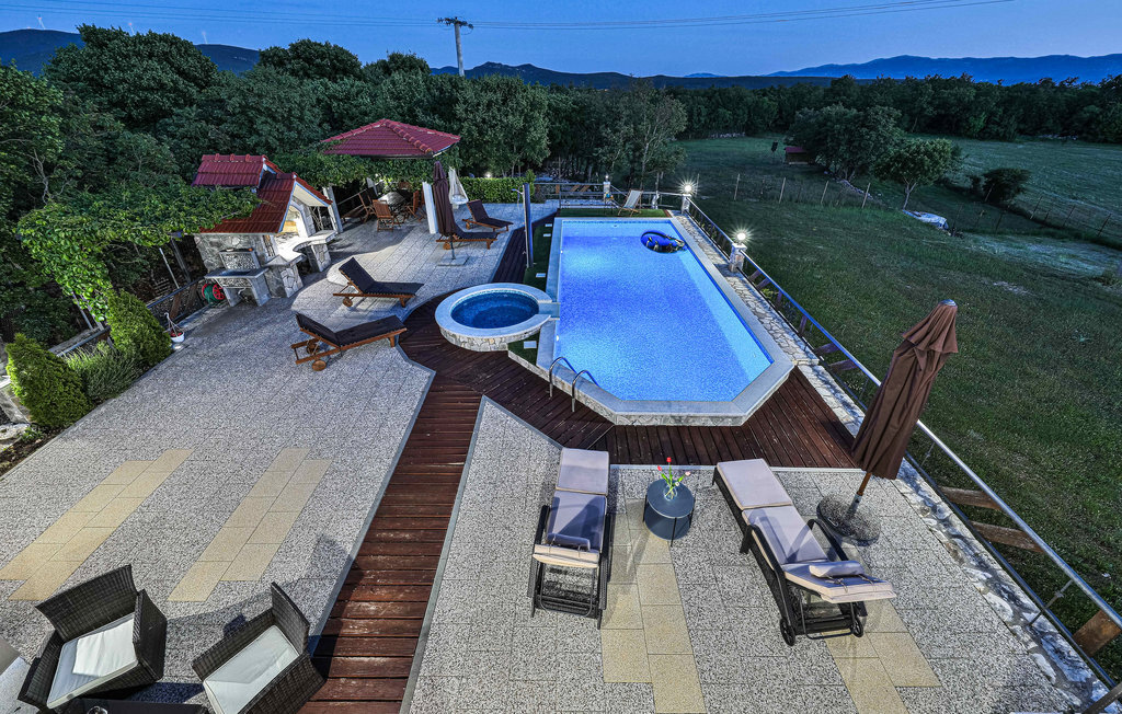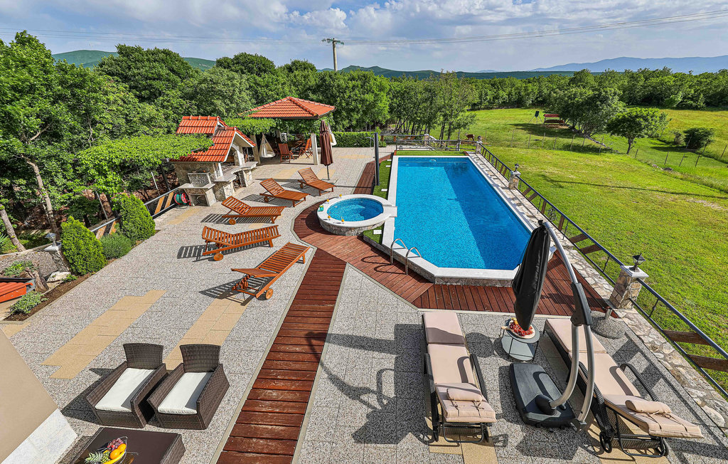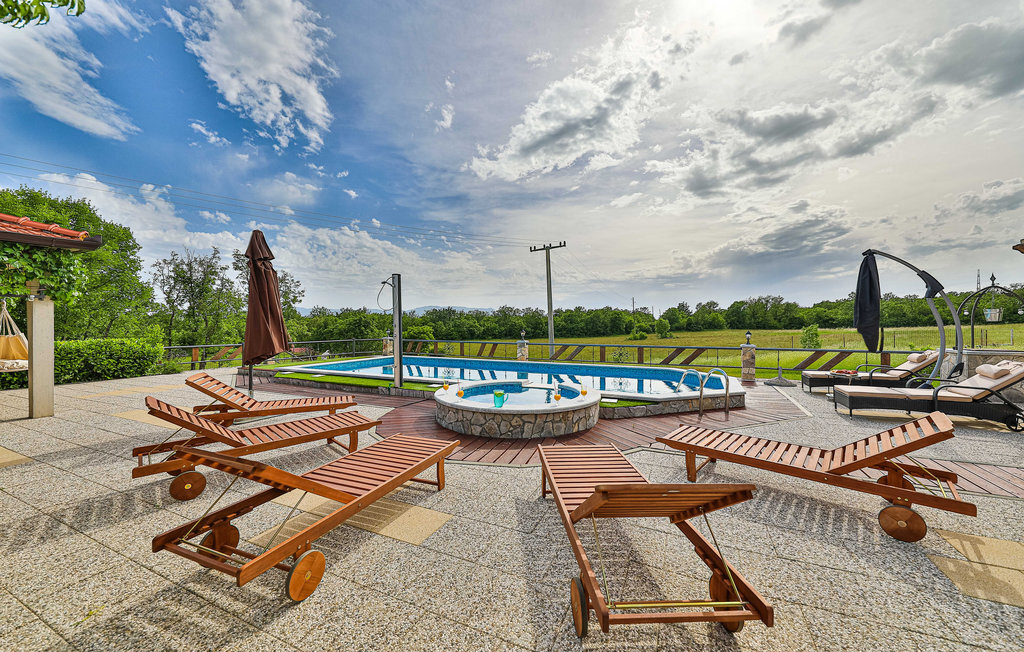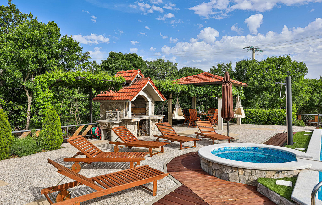Bien-être à l'extérieur : Location de vacances disposant de chaises-longues et d'un ou plusieurs équipements tels que piscine extérieure, jacuzzi extérieur, lit à baldaquin de jardin etc...