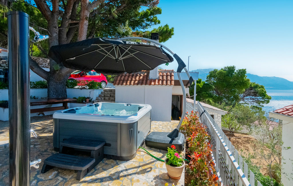 Bien-être à l'extérieur : Location de vacances disposant de chaises-longues et d'un ou plusieurs équipements tels que piscine extérieure, jacuzzi extérieur, lit à baldaquin de jardin etc...