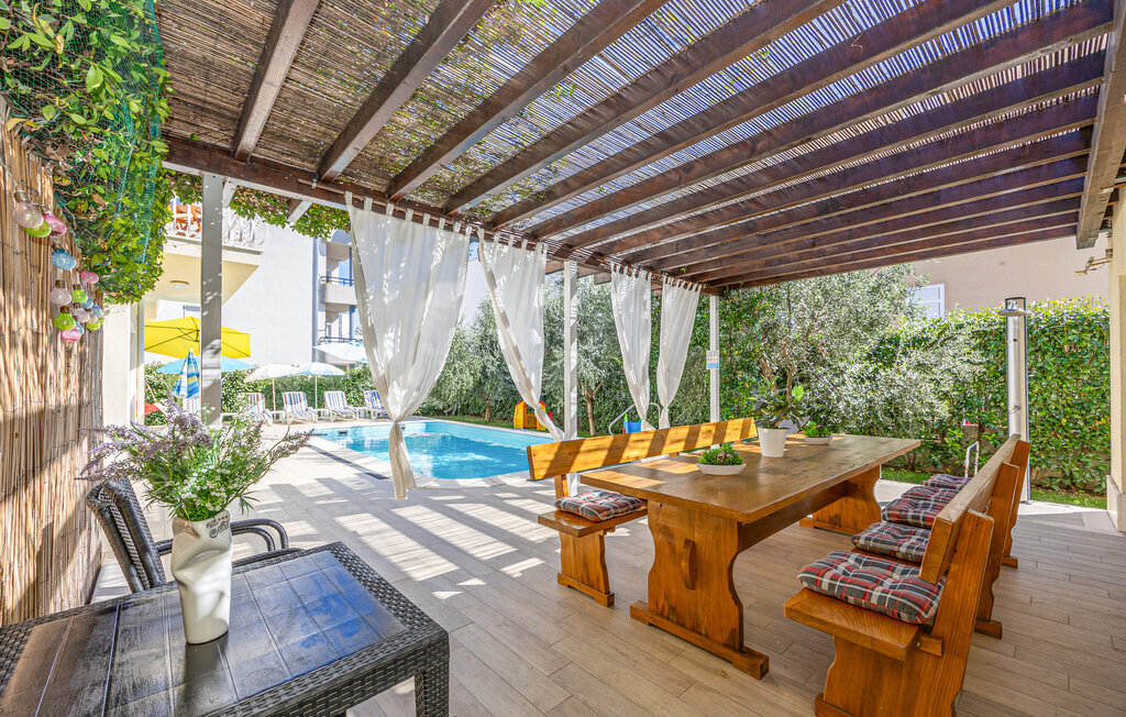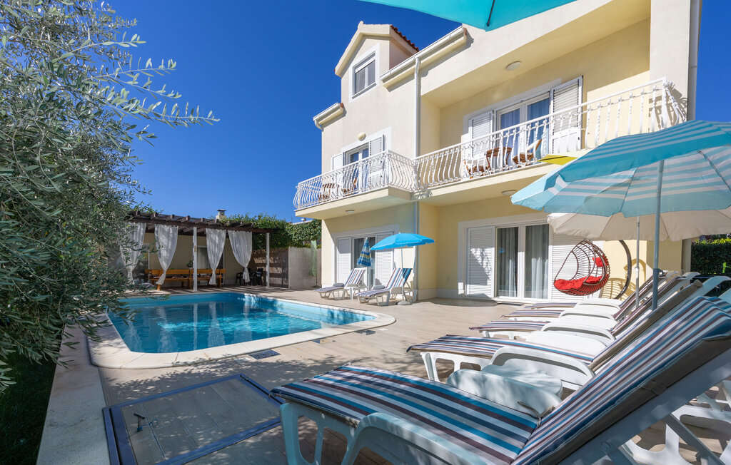 Bien-être à l'extérieur : Location de vacances disposant de chaises-longues et d'un ou plusieurs équipements tels que piscine extérieure, jacuzzi extérieur, lit à baldaquin de jardin etc...