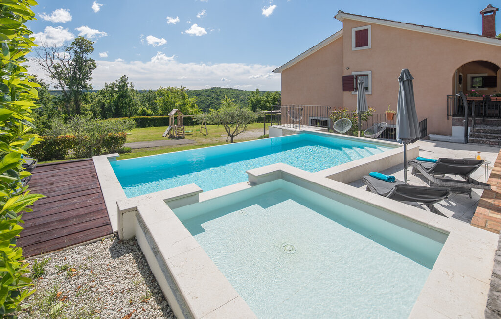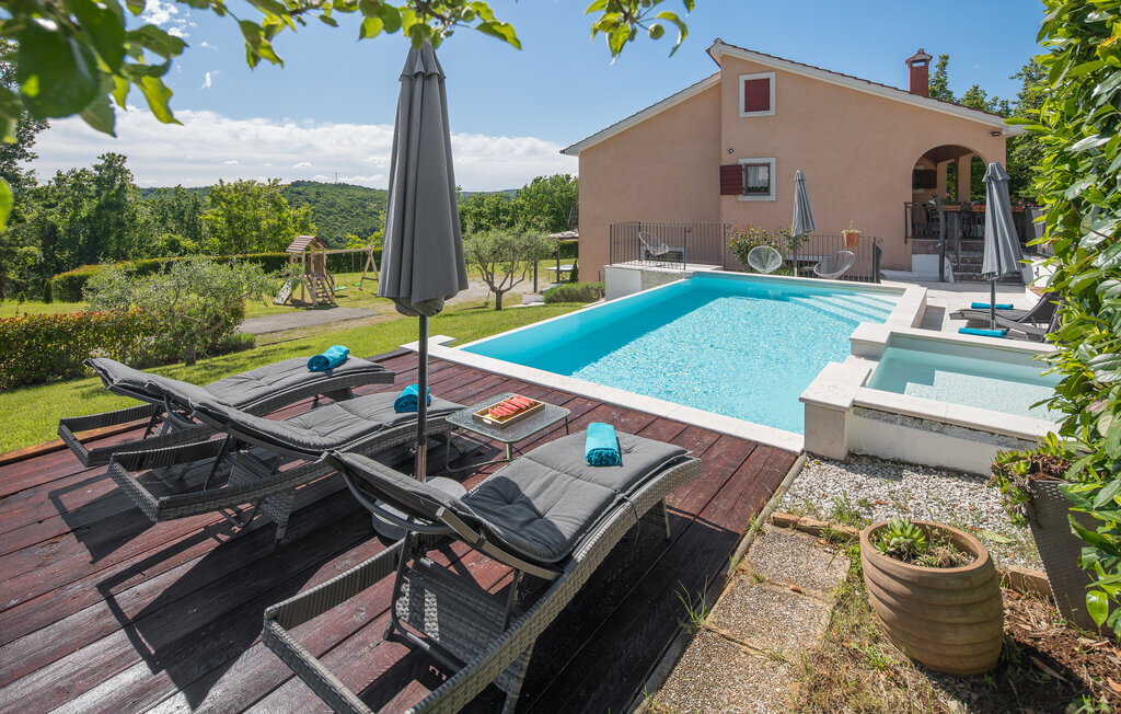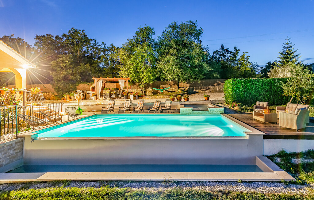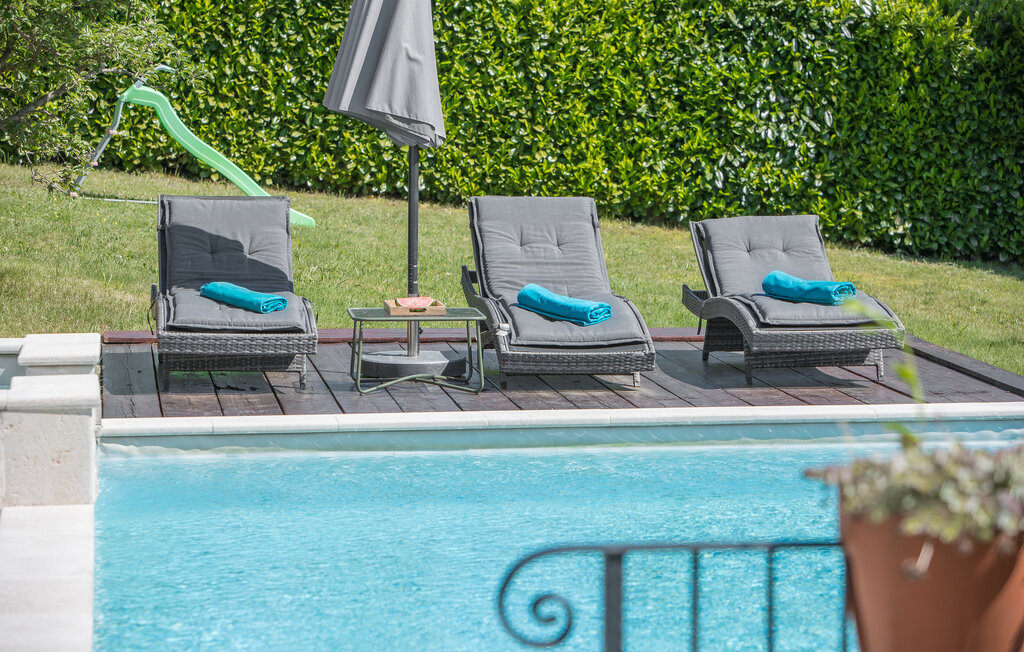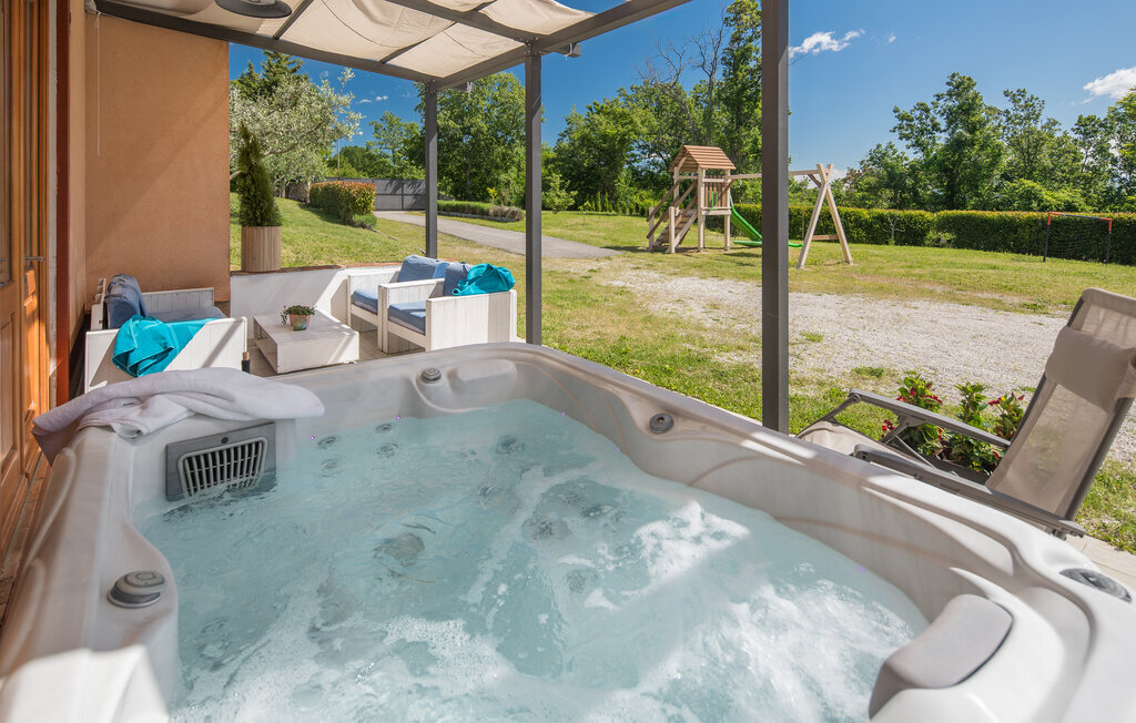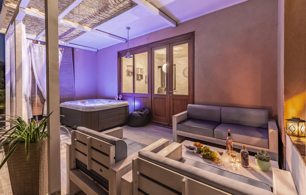Bien-être à l'extérieur : Location de vacances disposant de chaises-longues et d'un ou plusieurs équipements tels que piscine extérieure, jacuzzi extérieur, lit à baldaquin de jardin etc...