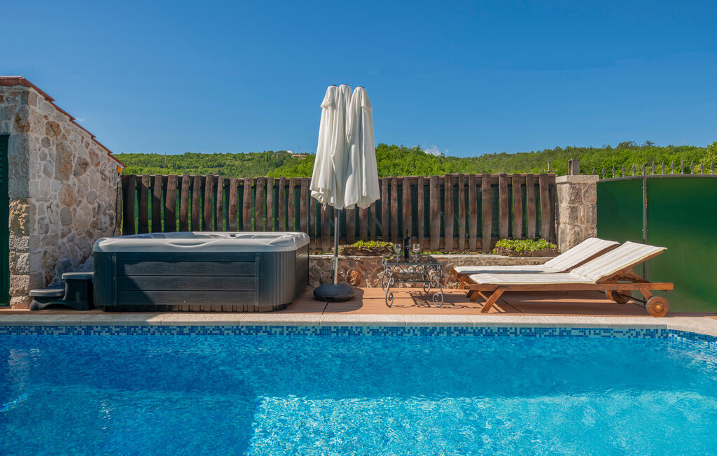 Bien-être à l'extérieur : Location de vacances disposant de chaises-longues et d'un ou plusieurs équipements tels que piscine extérieure, jacuzzi extérieur, lit à baldaquin de jardin etc...