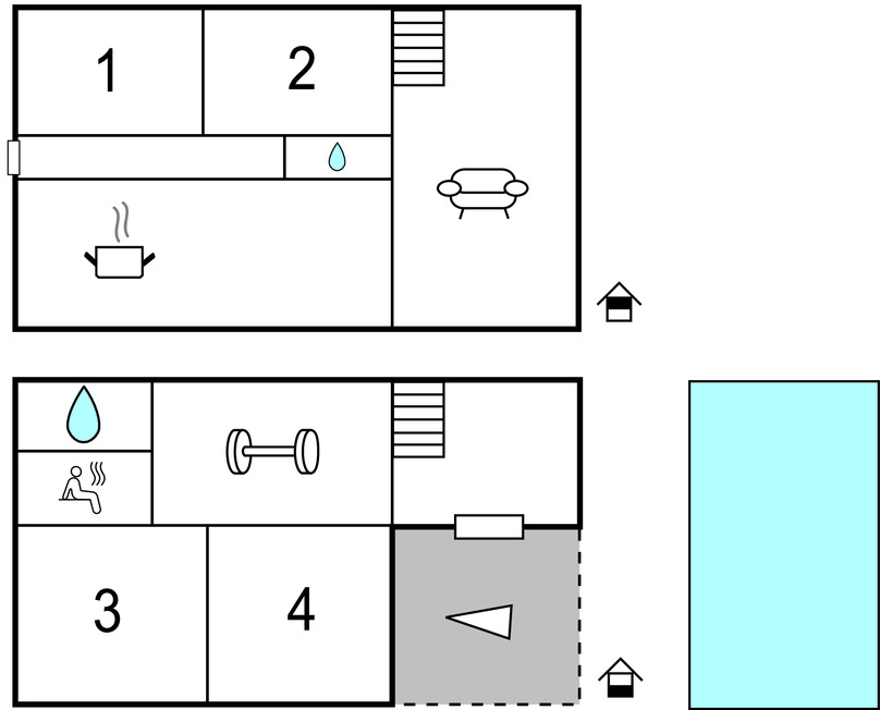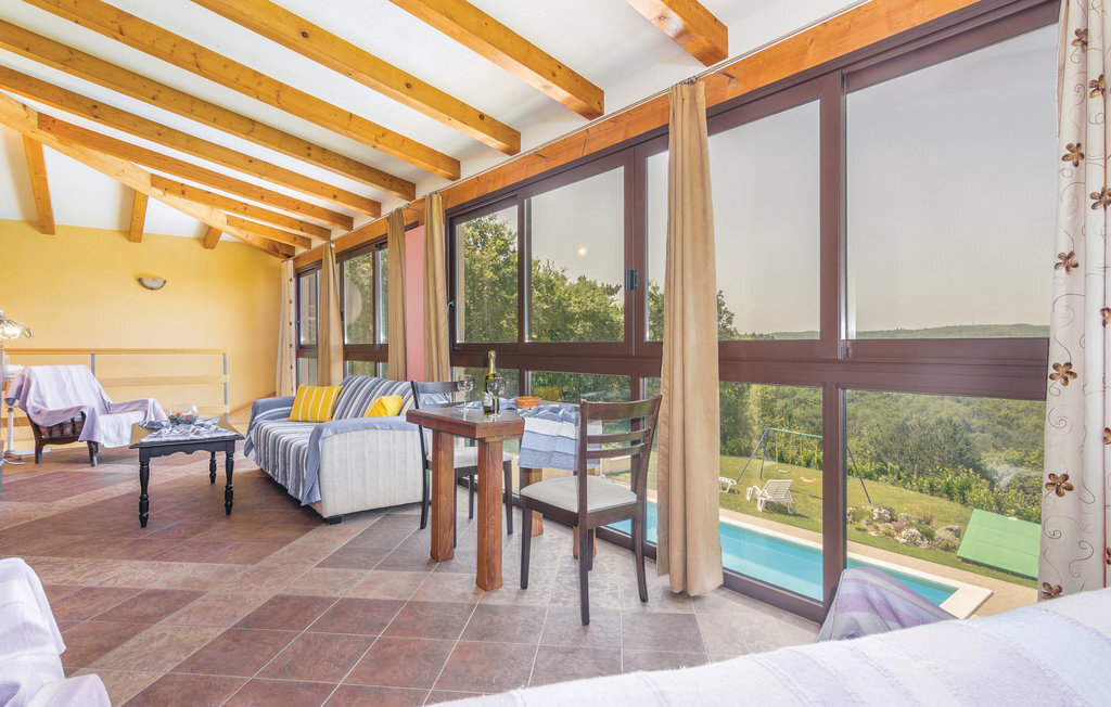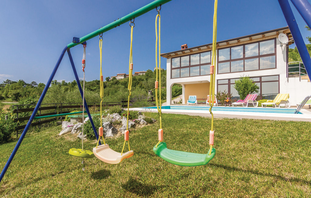 Elle est agréablement et confortablement équipée et remplit toutes les conditions pour des vacances reposantes. Dans le salon, vous pourrez passer de bons moments devant une authentique cheminée en pierre. Vous pourrez vous rafraîchir au bord de la piscine pendant les chaudes journées d'été et profiter de la vue magnifique sur le pittoresque paysage vallonné. Les plus petits pourront s'amuser sur la balançoire ou dans le bac à sable. Les vacanciers actifs peuvent se défouler dans la salle de fitness et se détendre ensuite dans le sauna ou jouer à la Playstation ou aux fléchettes.