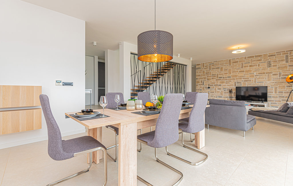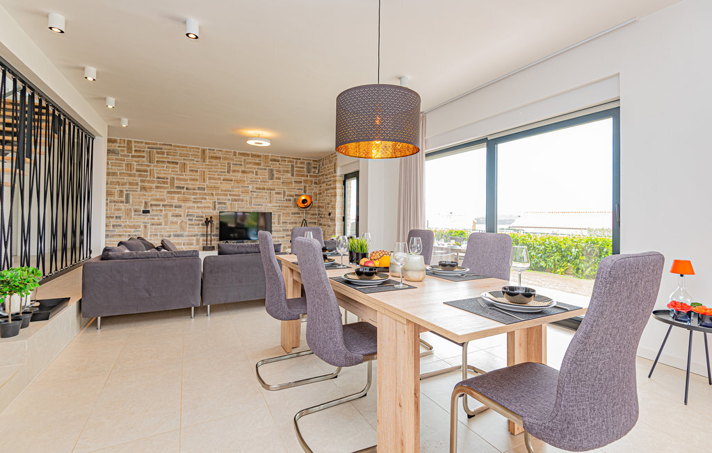 Avec son charme moderne, cette belle maison vous invite à passer un séjour reposant au bord de la mer. Vous vous sentirez tout de suite à l'aise dans les pièces claires, modernes et aménagées avec style. Les fenêtres du sol au plafond vous permettent de profiter au maximum de la vue fantastique. Détendez-vous le soir sur le canapé spacieux du salon, dînez tous ensemble autour de la longue table à manger et profitez des moments passés ensemble.